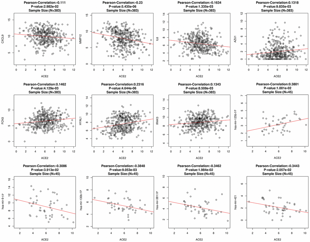 The fluctuation of gene expression often involves complicated regulatory networks. To study the potential mechanism of ACE2 dysregulation in LUAD, the relevant molecular around ACE2 were identified. After screening and comparison, a total of 7 differentially expressed correlative genes (DECGs) and 5 differentially expressed correlative miRNAs (DECMs) were detected respectively. In addition, the DECGs (CXCL9, MMP12, IL6, AZU1, FCN3, HYAL1, IRAK3) were involved in multi defense virus processes and the DECMs (miR-125b-5p, miR-9-5p, miR-130b-5p, miR-381-3p, miR-421) were predicted to target the 3’ untranslated regions (UTR) of ACE2 (Figure 2 and Supplementary Figure 1). Among them, CXCL9, MMP12, miR-9-5p, miR-130b-5p, miR-381-3p and miR-421 were increased while IL6, AZU1, FCN3, HYAL1, IRAK3 and miR-125b-5p were reduced in LUAD patients. Meanwhile, AZU1, FCN3, HYAL1, IRAK3 and miR-125b-5p were positively correlated with ACE2 while CXCL9, MMP12, IL6, miR-9-5p, miR-130b-5p, miR-381-3p, and miR-421 were negatively correlated (Figure 3). Notably, only miR-125b-5p has an opposite expression trend with ACE2. Thus, miR-125b-5p was assumed to be the single upstream predicted inhibitor of ACE2. In addition, among the 7 DECGs, IL6 owns the highest mutation frequency (5%) in LUAD patients might indicate that IL6 could mediate carcinogenesis (Supplementary Figure 2).
