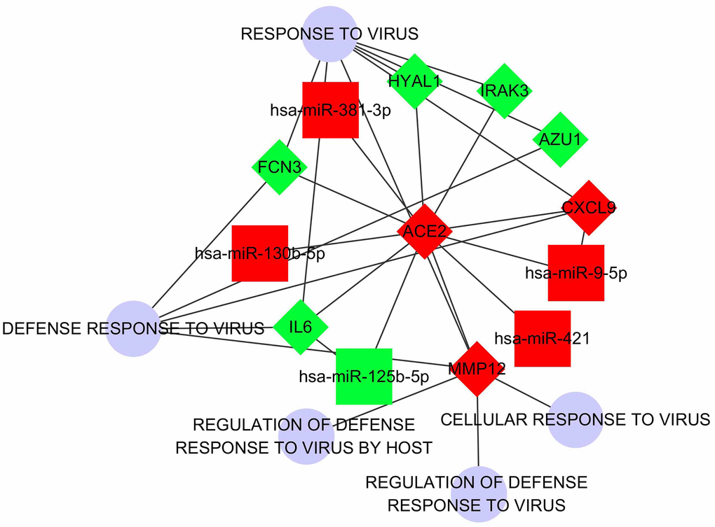 To understand the involved pathways and functions of the DECGs and DECMs in LUAD, enrichment analysis was performed (Supplementary Figure 3). A total of 41 pathways and 129 GO functions were enriched based on DECGs and DECMs. Interestingly, both 2 DECGs (CXCL9, IL6) and 4 DECMs (miR-125b-5p, miR-9-5p, miR-130b-5p, and miR-421) were enriched in the toll-like receptor signaling pathway (Supplementary Figure 4). In this pathway, CXCL9 takes part in chemotactic effects of T cells while IL6 participates in proinflammatory effects. Then according to the relationships between DECGs, DECMs and virus-associated processes, an interaction network was constructed (Figure 4). Notably, not only ACE2 but IL6 were predicted as the targets of miR-125b-5p. Similarly, both ACE2 and CXCL9 were regarded as the predicted target of miR-9-5p. However, due to the expression trend of CXCL9 and miR-9-5p were not opposite with ACE2, it was suggested that both CXCL9 and miR-9-5p may not play a decisive role in ACE2 expression.
