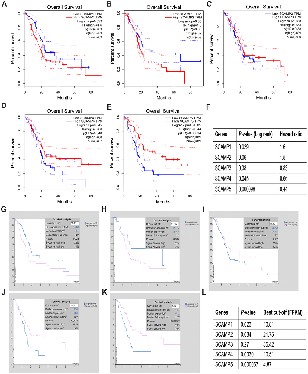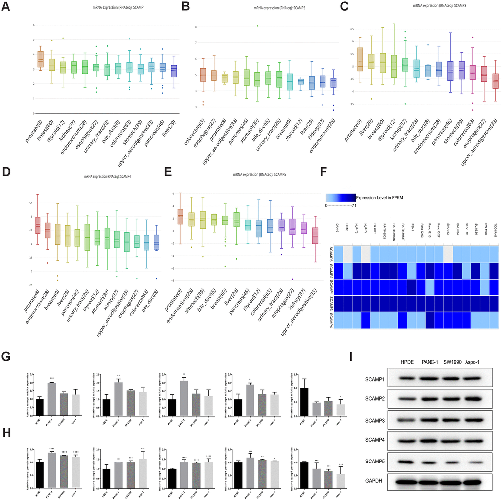 We also validated the expression of SCAMPs in PAAD cell lines (PANC-1, SW1990 and AsPC-1 cell) and normal human pancreatic ductal cell (HPDE cell) by Real-time quantitative PCR and Western blot assay. The result showed that SCAMPs1-4 were overexpressed in PANC-1 cell; whilst SCAMP5 was expressed to low levels in AsPC-1 cell line (Figure 2G–2I).