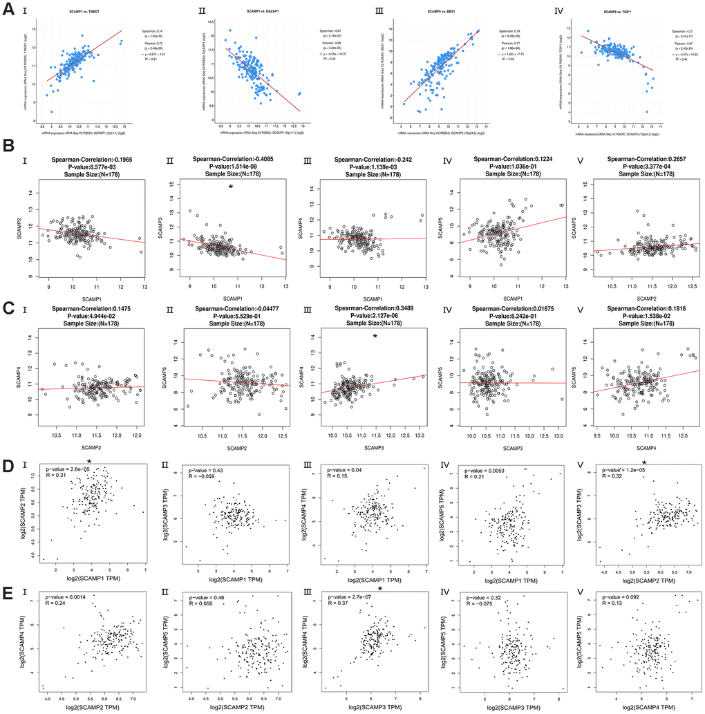 The cBioPortal for Cancer Genomics was used to analyze the co-expression of SCAMPs1, 5 from 179 PAAD tumors. The most significant genes that correlated with SCAMPs 1 and 5 (Figure 5A) were TMED7 (positive Spearman’s Correlation=0.742 p<0.001), DAZAP1 (negative Spearman’s Correlation=-0.673 p<0.001) and BEX1 (positive Spearman’s Correlation= 0.786 p<0.001) and TGIF1 (negative Spearman’s Correlation= -0.572 p<0.001). Other identified genes are summarized in Supplementary Table 1. Using the LinkedOmics database, SCAMP1 was found to negatively correlate with SCAMP 3 (spearman correlation: -0.4085, p < 0.01), whilst SCAMP3 positively correlated with SCAMP4 (spearman correlation: 0. 3489, p < 0.0001) (Figure 5B, 5C). These data were verified in the GEPIA datasets in which SCAMP1 correlated with SCAMP2 (R: 0.31, p < 0.05), whilst SCAMP3 correlated with SCAMP4 (R: 0.37, p < 0.05), (Figure 5D, 5E) in PAAD samples.