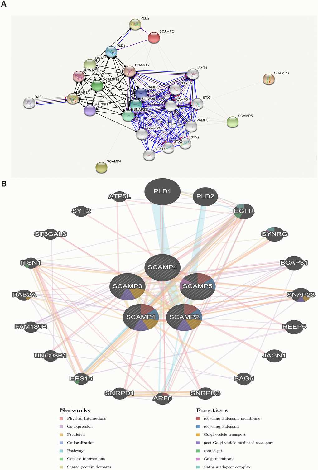 We firstly constructed PPI network of SCAMPs family by the predicted mode of molecular action, and constructed a two-layered model to reveal the regulatory networks of the SCAMPs in PAAD using GeneMania. The outer layer included genes co-expressed and interacting with PLD1, ATP5L, PLD2, SYT2, EGFR, ST3GAL3, SYNRG, BCAP31, ITSN1, RAB2A, SNAP23, FAM189B, REEP5, UNC93B1, JAGN1, EPS15, BAG6, SNRPD1, ARF6, and SNRPD3 (Figure 7).
