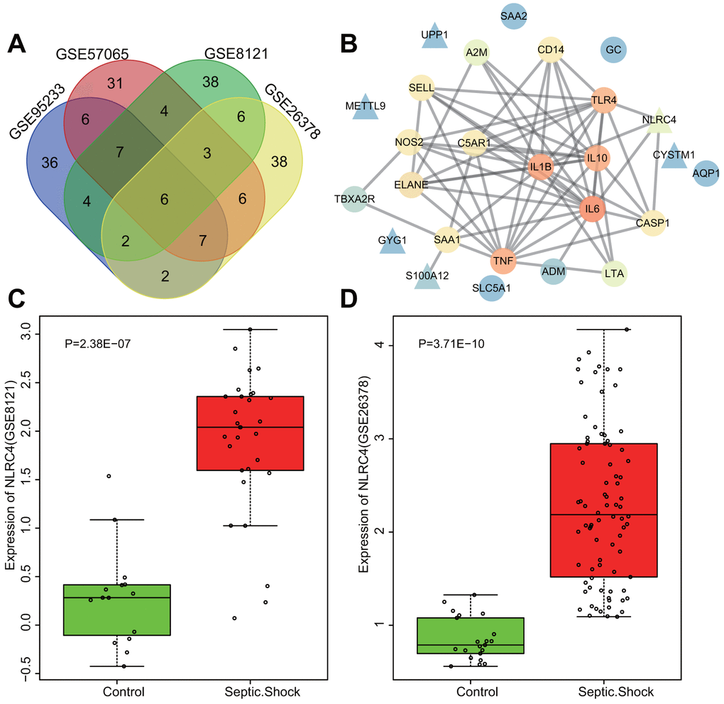 Datasets regarding septic shock obtained from the gene expression omnibus (GEO) database (https://www.ncbi.nlm.nih.gov/geo/) were differentially analyzed, with adj.P.Val < 0.05 and |LogFoldChange| > 2 as the screening threshold. A total of 1123, 864, 416 and 585 differentially expressed genes (DEGs) were retrieved from the GSE95233, GSE57065, GSE8121 and GSE26378 datasets (Table 1) respectively, among which the top 70 DEGs with the largest fold change were selected from each microarray for intersectional analysis with a Venn diagram (http://bioinformatics.psb.ugent.be/webtools/Venn/) (Figure 1A). The diagram highlighted 6 intersected genes (S100A12, UPP1, GYG1, NLRC4, METTL9, and CYSTM1) as candidates for further investigation. Additionally, disease genes associated with septic shock were retrieved from the DisGeNET database (http://www.disgenet.org/web/DisGeNET/menu/search?4), with the top 20 genes (TNF, C5AR1, GC, AQP1, NOS2, SELL, TBXA2R, A2M, ELANE, IL6, IL10, TLR4, CASP1, ADM, IL1B, LTA, CD14, SAA1, SAA2 and SLC5A1) considered to be septic shock-related genes. The interaction between septic shock-related genes and DEGs was analyzed using the String database (https://string-db.org/). The PPI net was produced via Cytoscape 3.6.0 software [11] (Figure 1B), wherein NLRC4 was discovered to be closely associated with several septic shock-related genes, signifying association with the occurrence of septic shock. Supplementary Figure 1A, 1B illustrate the heat maps of the top 70 DEGs in the microarrays of GSE95233 (Figure 1C) and GSE57065 (Figure 1D). Moreover, higher expression of NLRC4 was observed among patients with septic shock compared to healthy individuals. NLRC4 is a member of the NLR family that is involved in the activation of the NLR pathway associated with inflammatory reactions [12, 13]. Previous reports have demonstrated that NOD1 and NOD2 exert significant roles in septic shock [14, 15], yet the exact extent of the influence and mechanism of NLRC4 in septic shock still remains unclear. Given the above bioinformatics analysis and preliminary findings, we suspected that abnormal expressions of NLRC4 might influence the NLR pathway in septic shock.