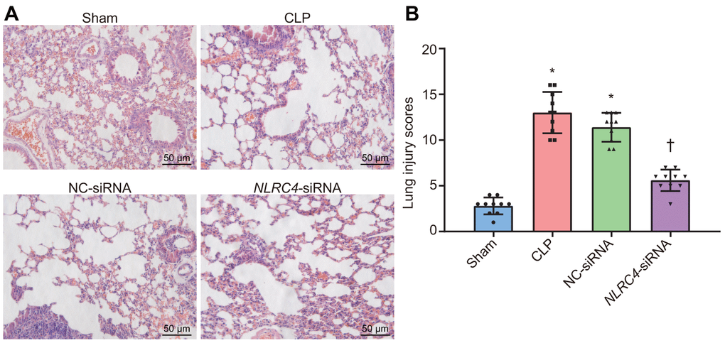 Lung tissue injury induced by septic shock was assessed after DCs were transfected with NLRC4-siRNA. Hematoxylin and eosin (HE) staining results (Figure 2A) revealed that in the sham group, the lobule-alveolar structure in the mouse lung tissue was intact with mild widened-gaps without fiber tissue hyperplasia or inflammatory cell exudation in the alveolar spaces. The mice in the cecal ligation and puncture (CLP) and negative control (NC)-siRNA groups presented with symptoms and signs of alveolar congestion, hemorrhage, alveolar wall thickening, fracture and collapse in most of the mouse lung tissue. Large amounts of inflammatory cells were also detected in the alveoli lumen and interstitial tissues of lungs. In the NLRC4-siRNA group, mice displayed intact alveolar structures in the lungs, with the presence of mild widened-gaps but without hemorrhage, well-preserved fibrous structure, or inflammatory exudate in the alveolar spaces. Lung tissue injury scoring revealed that the CLP and NC-siRNA groups received significantly higher lung tissue injury scores compared to that of the sham group. In comparison, significantly lower lung tissue injury scores were observed in the NLRC4-siRNA group relative to that of the CLP and NC-siRNA groups (Figure 2B). Based on the aforementioned observations, we concluded that NLRC4 gene silencing could alleviate lung tissue injury induced by septic shock.