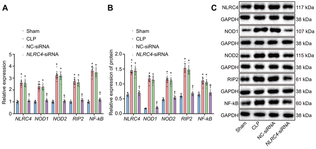 Western blot analysis results elaborated that the CLP and NC-siRNA groups exhibited significantly increased protein expressions of NLRC4, NOD1, NOD2, RIP2, and NF-κB compared to that of the sham group (all psham vs. CLP < 0.001; psham vs. NC-siRNA < 0.001), while no changes were detected regarding protein expressions of NLRC4 (psham vs. NLRC4-siRNA = 0.636), NOD1 (psham vs. NLRC4-siRNA = 0.124), NOD2 (psham vs. NLRC4-siRNA = 0.398), RIP2 (psham vs. NLRC4-siRNA = 0.389), or NF-κB (psham vs. NLRC4-siRNA = 0.574)in the NLRC4-siRNA group. In contrast with the CLP and NC-siRNA groups, remarkably declined protein levels of NLRC4, NOD1, NOD2, RIP2, and NF-κB were noted in the NLRC4-siRNA group (pCLP vs. NLRC4-siRNA < 0.001; pNC-siRNA vs. NLRC4-siRNA < 0.001). These results further verified that NLRC4 gene silencing blocked the NLR pathway (Figure 3A–3C).
