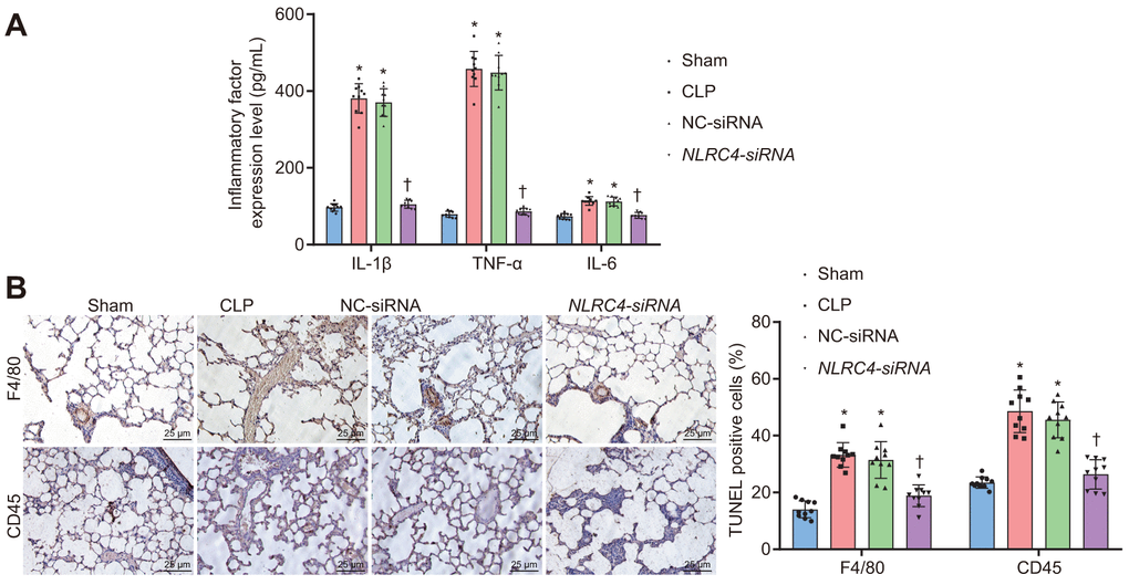 Enzyme-linked immunosorbent assay (ELISA) was performed on septic mice after their DCs were transduced with different vectors to evaluate the effects of NLRC4 gene silencing on the inflammatory reaction of septic shock. Results (Figure 4A) demonstrated that the CLP and NC-siRNA groups exhibited markedly elevated levels of Interleukin (IL)-1β, tumor necrosis factor α (TNF-α) and IL-6 compared to that of the sham group (all psham vs. CLP < 0.001; psham vs. NC-siRNA < 0.001), while no remarkable differences were observed in the expression levels of IL-1β (psham vs. NLRC4-siRNA = 0.085), TNF-α (psham vs. NLRC4-siRNA = 0.382) or IL-6 (psham vs. NLRC4-siRNA = 0.889) in the NLRC4-siRNA group. Reduced levels of IL-1β, TNF-α and IL-6 were detected in the NLRC4-siRNA group, compared with the sham and NC-siRNA groups (all pCLP vs. NLRC4-siRNA < 0.001; pNC-siRNA vs. NLRC4-siRNA < 0.001), which suggested that NLRC4 gene silencing alleviated the inflammatory reaction induced by septic shock. As reflected by Figure 4B, immunohistochemistry results revealed that the CLP and NC-siRNA groups exhibited markedly elevated levels of F4/80 (psham vs. CLP < 0.001; psham vs. NC-siRNA < 0.001) and CD45 (psham vs. CLP < 0.001; psham vs. NC-siRNA < 0.001) compared to the sham group (all psham vs. CLP < 0.001; psham vs. NC-siRNA < 0.001), whereas no marked changes were seen on the levels of F4/80 (psham vs.NLRC4-siRNA = 0.602) and CD45 (psham vs. NLRC4-siRNA = 0.619) in the NLRC4-siRNA group. The levels of F4/80 (pCLP vs. NLRC4-siRNA < 0.001; pNC-siRNA vs. NLRC4-siRNA < 0.001) and CD45 (pCLP vs. NLRC4-siRNA < 0.001; pNC-siRNA vs. NLRC4-siRNA < 0.001) in the NLRC4-siRNA group were markedly reduced in comparison to that of the CLP and NC-siRNA groups. Thus, these results indicated that NLRC4 gene silencing reduced infiltration of inflammatory cells.