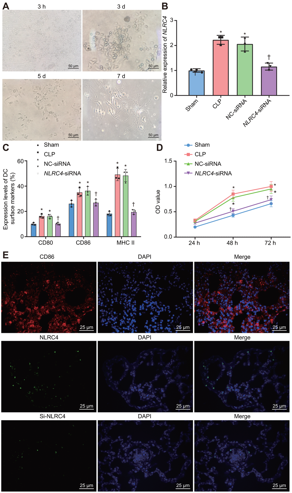 Morphological changes in DCs were observed under an inverted microscope. After 3 h of adherence, small round cells and a portion of the closely aggregated cells became apparent. On the 3rd day after culture, a pattern of small densely arranged round cells were observed with a trivial amount of bud-shaped protuberances. On the 5th day, adherent cells in dense arrangements were observed, with an increase in the bud-shaped protuberances. On the 7th day, DCs appeared to be spindle shaped, closely-arranged with a large number of distinct protuberances (Figure 5A). RT-qPCR was employed to detect the NLRC4 expression in DCs in each group (Figure 5B). The results demonstrated that NLRC4 expressions were elevated in the CLP and NC-siRNA groups in contrast to that of the sham group (psham vs. CLP < 0.001; psham vs. NC-siRNA < 0.001), whereas the expressions of NLRC4 did not differ significantly in the NLRC4-siRNA group (psham vs. NLRC4-siRNA = 0.719). Significantly diminished NLRC4 expressions were also detected in the NLRC4-siRNA group compared to that of the CLP and NC-siRNA groups (pCLP vs. NLRC4-siRNA < 0.001; pNC-siRNA vs. NLRC4-siRNA = 0.002). The findings illustrated that morphological changes in DCs induced by septic shock were improved by the silencing of NLRC4.