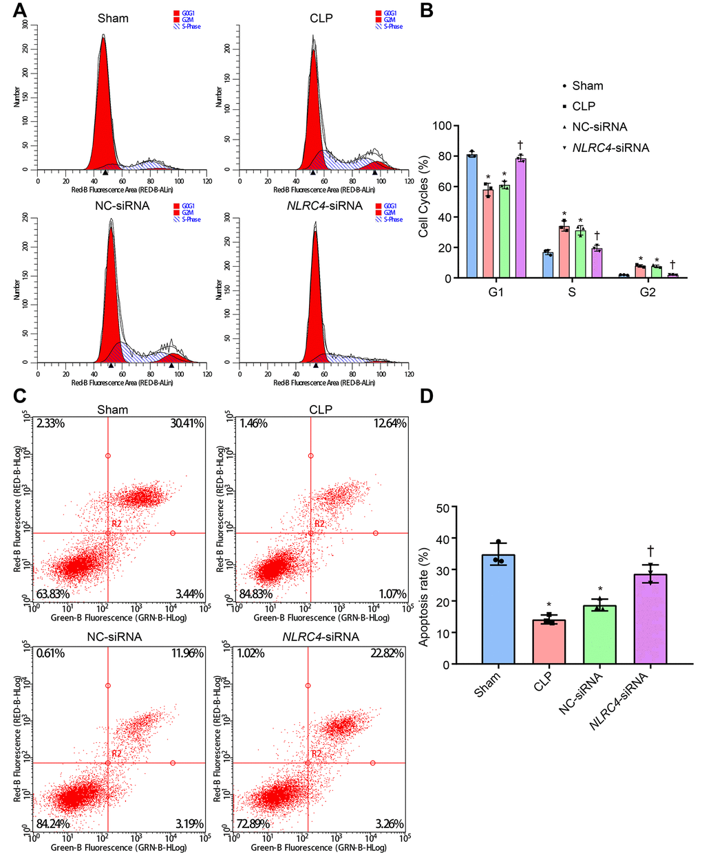 PI single staining and AnnexinV-FITC/PI double staining methods were finally adopted to observe changes in the DC cell cycle distribution post-transfection with different vectors. The results of PI single staining revealed that when compared with the sham group, the percentage of cells arrested at the G1 phase was notably reduced (shortened G1 phase), whereas the percentages of cells arrested at the G2 and S phase were significantly elevated (prolonged G2 and S phases) in the CLP and NC-siRNA groups (all psham vs. CLP < 0.001; psham vs. NC-siRNA < 0.001). No significant differences were detected in regards to cell cycle distribution in G1 (psham vs. NLRC4-siRNA = 0.663), G2 (psham vs. NLRC4-siRNA = 0.640) or S phase (psham vs. NLRC4-siRNA = 0.999) in the NLRC4-siRNA group. In comparison with the CLP and NC-siRNA groups, whereas the percentage of cells arrested at the G1 phase was elevated (prolonged G1 phase) and the percentages of cells arrested at the G2 and S phases were reduced (shortened G2 and S phases) in the NLRC4-siRNA group (all pCLP vs. NLRC4-siRNA < 0.001; pNC-siRNA vs. NLRC4-siRNA < 0.001).