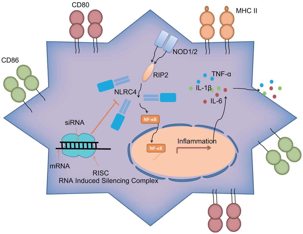Lastly, NLRC4 gene silencing was observed to suppress the maturation and proliferation of DCs, while promoting DCs apoptosis. DCs are widely recognized as specialized antigen-presenting cells which begin maturing upon coming in contact with antigens via recognized receptors [33]. Elevated DCs have been identified in the colonic mucosa of patients suffering from Crohn’s disease, another chronic inflammatory bowel disease [34]. Previous studies have further confirmed that NLRC4 promotes the cleavage and maturation of pro-inflammatory cytokines [24]. In a previous study, the activation of NLRC4 inflammasome has been documented in splenic DCs [35]. We speculated that NLRC4 silencing could inhibit maturation of DCs as well as inhibit their population. NLRC3 has been proposed to inhibit the processes related to colorectal cancer through the regulation of cellular proliferation and apoptosis levels [21]. A functional study demonstrated that NLRC5 gene silencing inhibits TGF-β1-induced proliferation, while promoting the apoptosis of LX-2 cells [36]. We acquired the basic understanding of the relationship between NLRC4 gene silencing and maturation, proliferation, and apoptosis of DCs, in accordance with the investigated literature as well as our obtained results.