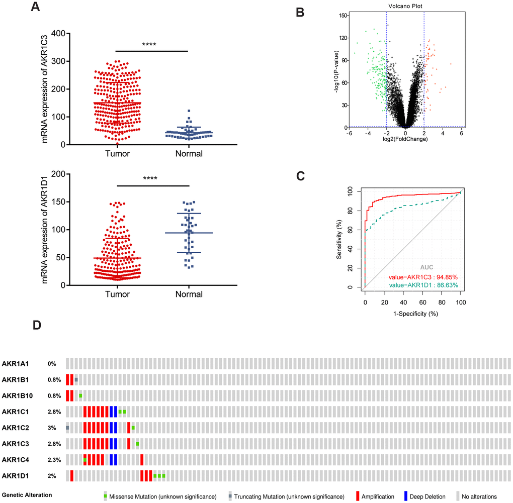 In the training set (TCGA dataset), the mRNA expressions of AKR1C3 and AKR1D1 were tested between tumor and normal samples using an unpaired Student t-test. To assess the efficacy of AKR1C3 and AKR1D1 in diagnosing HCC, we performed ROC analysis to investigate how large the area under the curve (AUC) was. Meanwhile, the genetic alteration rates of AKR1C3 and AKR1D1 were identified by accessing the cBioPortal for cancer genomics [44]. In the validation set, DEGs were obtained with the “Limma” R package in Rstudio software (version 1.3.959). And the cutoff values were set as follows: the adjusted P-value < 0.05 and |log2 fold change (FC)| > 2.