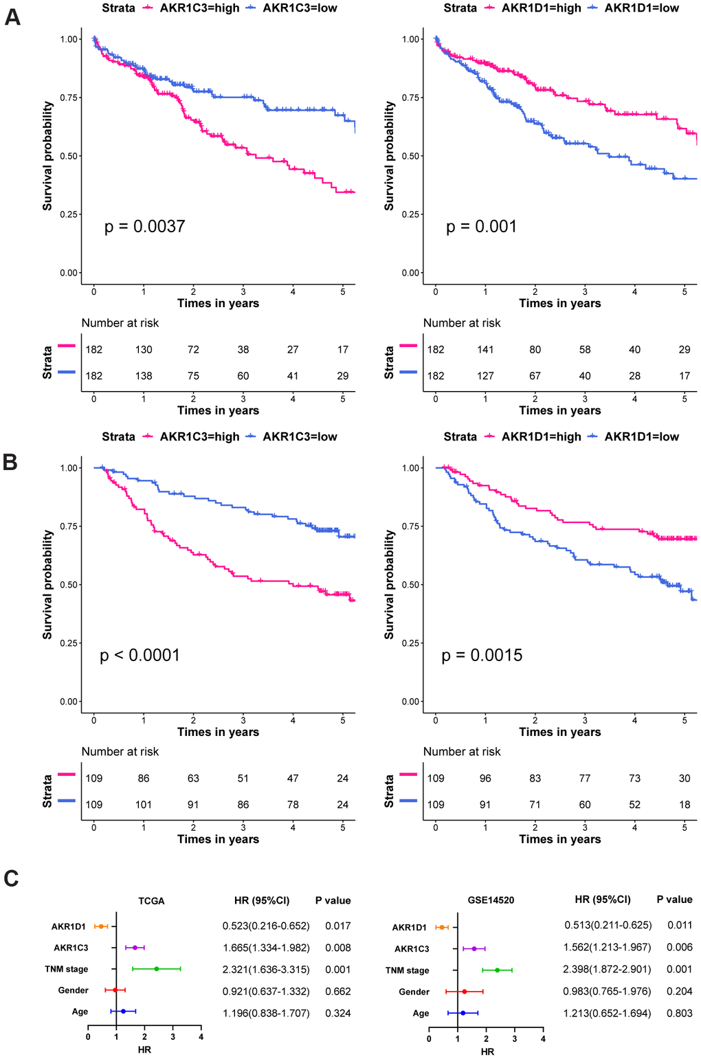 Initially, the training set (TCGA dataset) was equally divided into the high-expression group (n=182) and low-expression group (n=182) based on the median of AKR1C3 and AKR1D1. And the Kaplan-Meier method was used to estimate the differences between the high and low-expression groups with “survival” and “survminer” R package. Then, the multivariate analyses were analyzed by the Cox regression model, which was adjusted with gender, age, and TNM stage. Also, the validation set (GSE14520) was split into the high-expression group (n=109) and low-expression group (n=109), and then the survival analyses were repeated for accuracy.