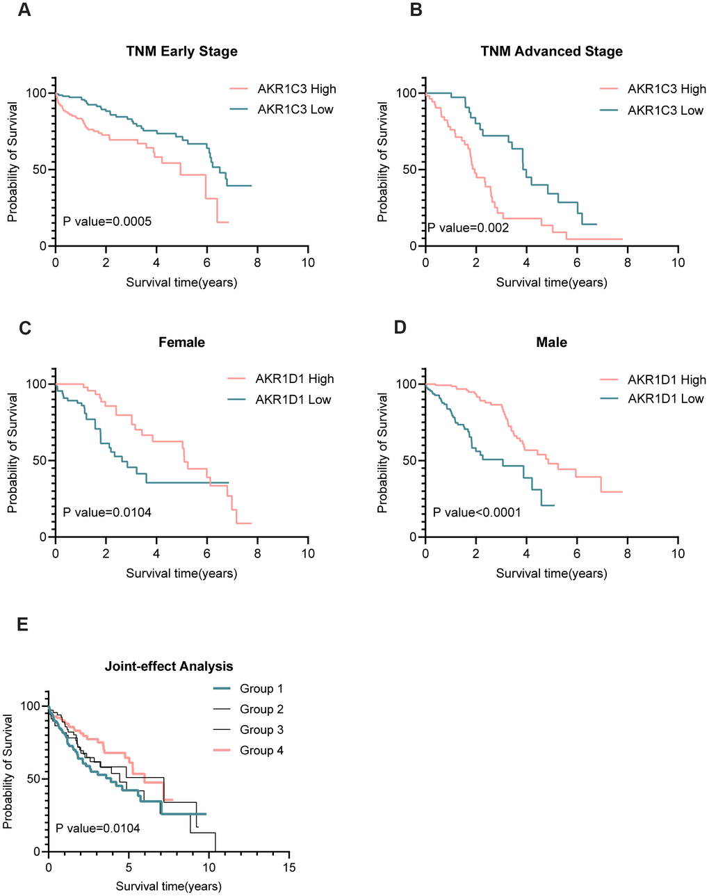 To explore the relationship between gene expression and tumor biological behavior, chi-square tests were performed between AKR1C3 (AKR1D1) and other characteristics. Further, the TNM stage and gender were stratified and survival analyses were conducted. Subsequently, group 1 (high AKR1C3, low AKR1D1), group 2 (high AKR1C3, high AKR1D1), group 3 (low AKR1C3, low AKR1D1), and group 4 (low AKR1C3, high AKR1D1). Then, the overall survival in the four groups was assessed using the Kaplan-Meier method.