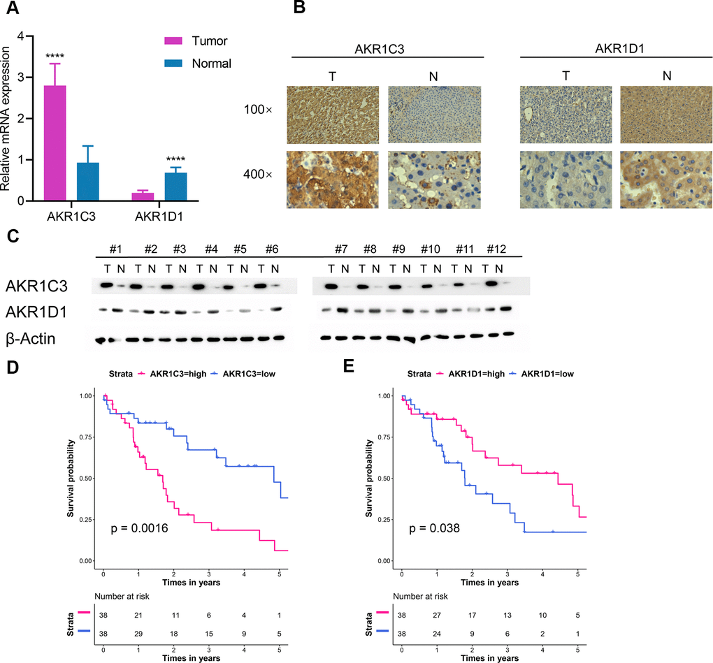 Immunohistochemistry staining was performed as previously described [41]. The tumor and normal tissues were fixed with 10% formalin for 72 h, embedded in paraffin, and then and then antigen repaired. The following rabbit polyclonal antibodies were used: Anti-AKR1C3 (1:100, ab236656, Abcam, Cambridge, MA, USA) and Anti-AKR1D1 (1:100, ab254943, Abcam, Cambridge, MA, USA). The staining was visualized using 1% DAB under light microscopy.