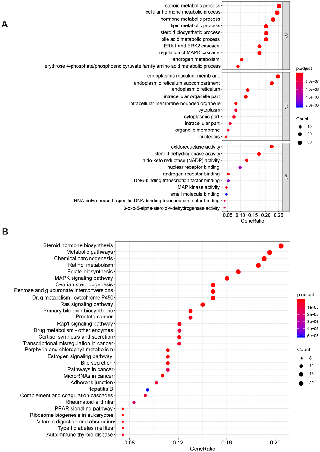 Aldo-keto reductases (AKRs) are NADP(H) oxidoreductases and catalyze reactions on a wide-ranging spectrum of substrates, including drugs and carcinogens [19, 20]. AKR1C3 is a member of the AKR superfamily and acts as a drug target in hormonal malignancies and endocrine disorders [21]. Previous studies revealed that the expression of AKR1C3 increased in prostate cancer and estrogen receptor-positive breast cancer, which were associated with significantly decreased survival [22, 23]. And AKR1C3 promoted hormonal cancers progression by enhancing local androgen and estradiol production via the “backdoor” pathway and membrane-bound estrogen receptor GPER, respectively [24–26]. In the research by Wang Bin et al., AKR1C3 also acted as a novel driver of epithelial-to-mesenchymal transition in cancer metastasis through the activation of ERK signaling [27]. In the present study, AKR1C3 was found to be significantly upregulated in HCC (Figure 1A, 1B) and then identified in clinical samples (Figure 4B, 4C). High expression of AKR1C3 was an independent risk factor for HCC and related to poor prognosis (Figure 2). Our data suggested that AKR1C3 might act as an oncogene to accelerate the HCC progression. On the other hand, AKR1D1 was reported to catalyze fundamental steps in bile acid synthesis and inactivate steroid hormones [28, 29]. Nikolaou Nikolaos et al. demonstrated that AKR1D1 silencing promoted hepatocyte triglyceride accumulation by increasing lipogenesis and fueling hepatocyte inflammation in non-alcoholic fatty liver disease [14, 30]. Also, AKR1D1 over-expression decreased glucocorticoid production and glucocorticoid receptor activation in human hepatoma cells [15, 31]. In our study, the diagnostic effect of AKR1D1 was tested with ROC (AUC=0.866, Figure 1C). And the high expression of AKR1D1 was an independent factor in HCC and associated with longer median survival time (Figure 2). The results demonstrated that AKR1D1 might prevent liver carcinogenesis and this was in line with earlier research. Further bioinformatics analysis suggested that the two genes were significantly enriched in MEK/ERK and AR signaling pathway (Figure 5A), which provided some guidance for the following studies.
