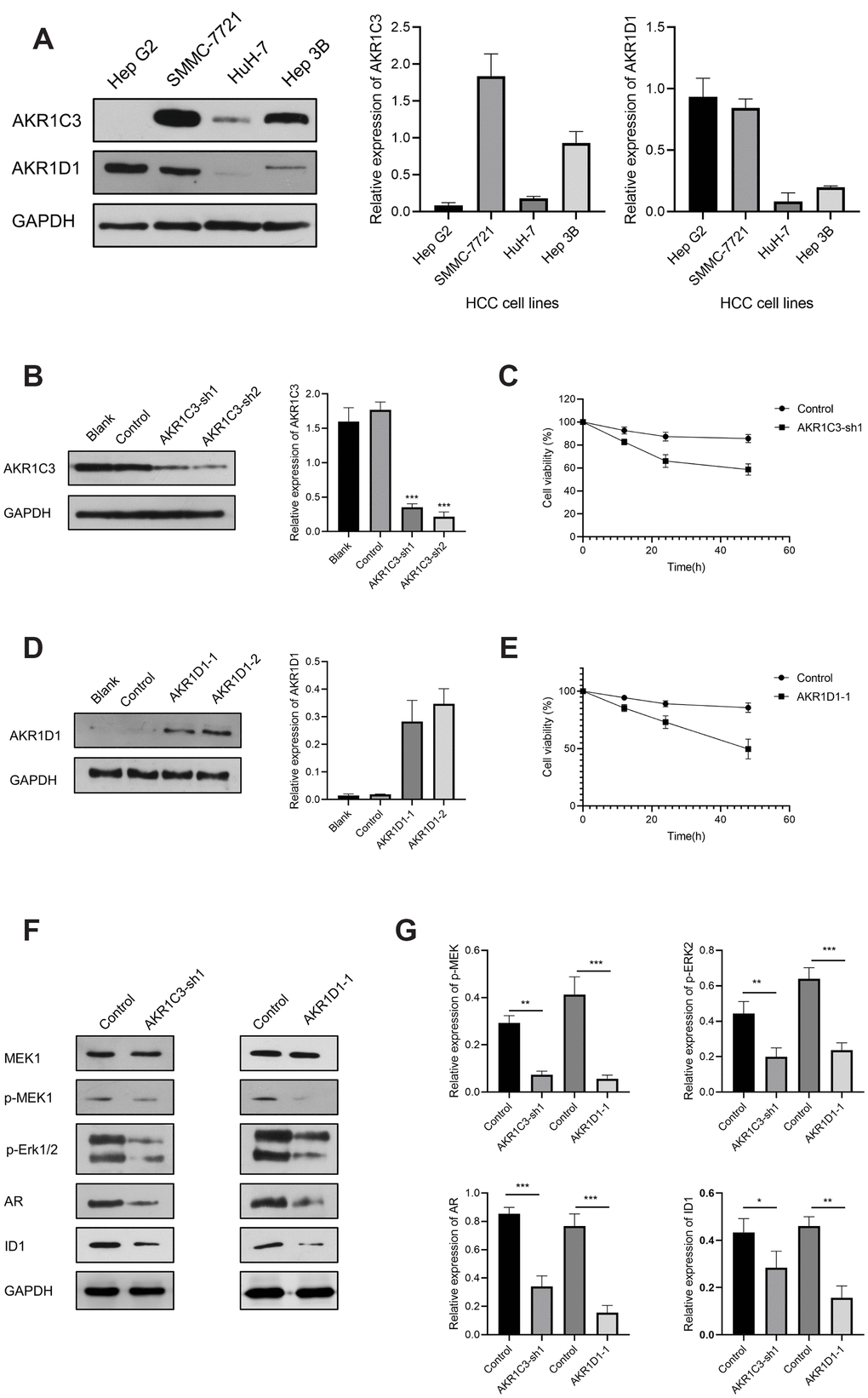To explore the potential mechanism of AKR1C3 and AKR1D1, protein-protein interaction (PPI) and enrichment analysis were initially conducted. The results of PPI revealed that AKR1C3 and AKR1D1 might interact with various key proteins, including MAPK1, MAPK3, MAP3K2, and AR (Supplementary Figure 2). Then, the GO and KEGG enrichment analysis suggested that AKR1C3 and AKR1D1 might regulate steroid metabolic process, bile acid metabolic process, MAPK cascade activity, and androgen metabolism (Figure 5A, 5B). Then, the protein levels of AKR1C3 and AKR1D1 were detected in HCC cell lines. And AKR1C3 had the highest expression in SMMC-7721, while AKR1D1 had the lowest expression in HuH-7 (Figure 6A). After the knockdown of AKR1C3 in SMMC-7721 cells, the cell viability significantly decreased and the overexpression of AKR1D1 in HuH-7 cells also inhibited cell proliferation (Figure 6B–6E). Further study revealed that the knockdown of AKR1C3 and overexpression of AKR1D1 decreased the p-MEK, p-Erk1/2, AR, and ID1 protein expression (Figure 6F, 6G). Our studies suggested that AKR1C3 and AKR1D1 might oppositely regulate MEK/Erk and AR signaling pathways.