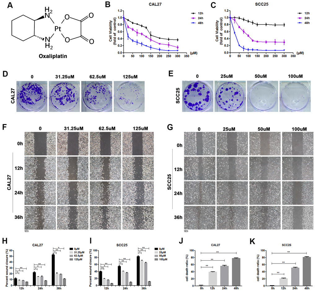 Oxaliplatin inhibited cell viability, migration, and cloning formation of OSCC cells and induced cell death in vitro