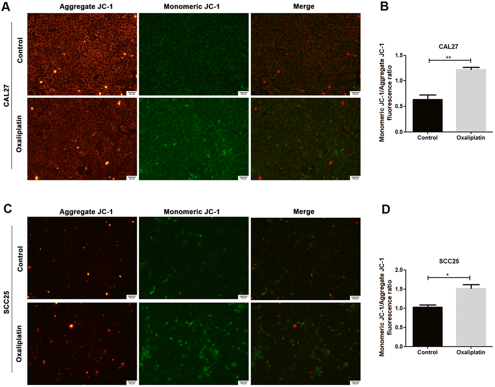 JC-1 assay was used to detect whether oxaliplatin could cause mitochondrial damage in OSCC cells. Generally, JC-1 accumulates in mitochondria and presents high red fluorescence (aggregate JC-1). But when mitochondria are damaged, JC-1 tends to exist in the cytoplasm and presents green fluorescence due to a decrease in the mitochondria membrane potential (monomeric JC-1). As shown in Figure 3A–3D, when CAL27 and SCC25 cells were treated with oxaliplatin, monomeric JC-1 was increased and aggregate JC-1 was decreased, indicating that oxaliplatin induced depolarization and damage in the mitochondrion among OSCC cells.
