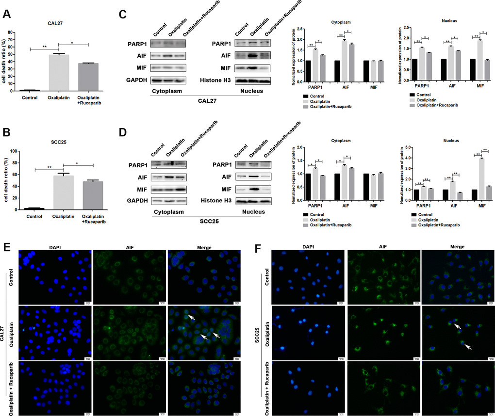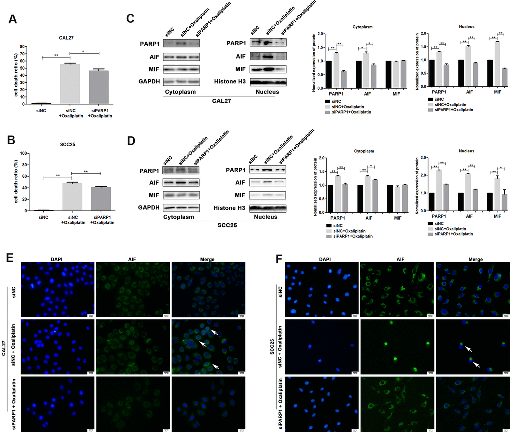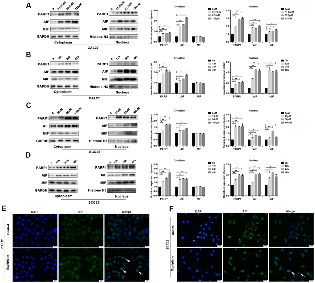 Oxaliplatin led to the upregulation of PARP1 and nuclear translocation of AIF in OSCC cells