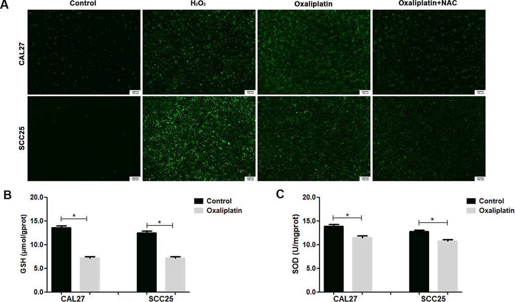 CAL27 and SCC25 cells were treated with PBS or oxaliplatin, and then they were collected and homogenized in ice-cold PBS. After being centrifuged for 15 minutes at 12,000 rpm at 4° C, the supernatants were collected and used for the analysis. Total GSH and SOD detection assays were performed using the Micro Reduced Glutathione (GSH) Assay Kit (Nanjing Jiancheng, Nanjing, China) and Total SOD Detection Kit (Nanjing Jiancheng, Nanjing, China) according to the manufacturer's protocol.