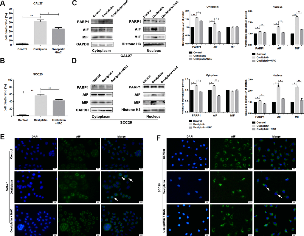 To investigate whether ROS affected oxaliplatin-induced parthanatos, we pretreated CAL27 and SCC25 cells with antioxidant NAC for 1 hour. As shown in Figure 7A, NAC effectively inhibited the production of ROS, which was induced by oxaliplatin. Then, by measuring LDH release, we found that inhibiting the production of ROS can reduce the cell death induced by oxaliplatin in CAL27 and SCC25 cells (Figure 8A, 8B). Similarly, western blot results showed that NAC significantly inhibited oxaliplatin-induced overexpression of PARP1, AIF, and MIF in the nucleus of OSCC cells (Figure 8C, 8D). The results of immunofluorescence showed that NAC repressed nuclear translocation of AIF mediated by oxaliplatin (Figure 8E, 8F). Thus it could be seen that the production of ROS played an important role in oxaliplatin-induced parthanatos.