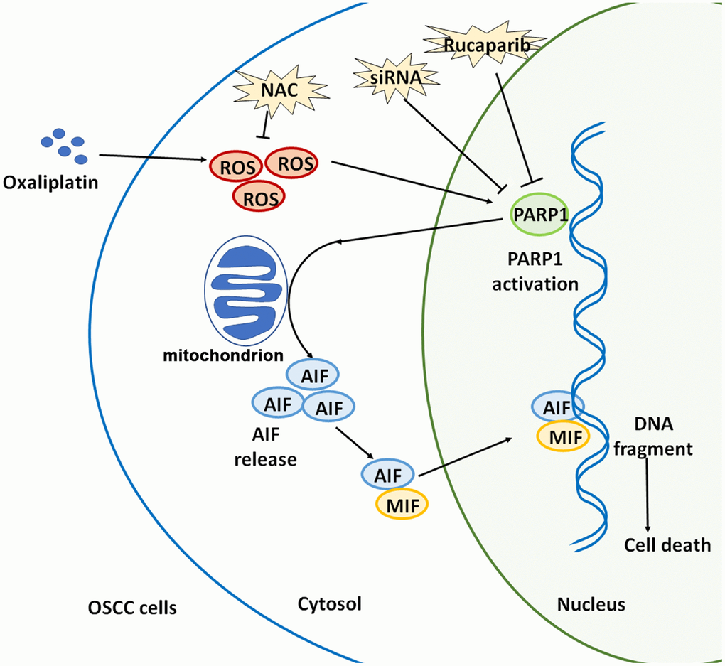 Collectively, oxaliplatin is a novel third-generation platinum-based chemotherapeutic drug, and oxaliplatin can completely exert its clinical therapeutic effects only when its anti-tumor mechanism is elucidated. This study confirmed that oxaliplatin can increase the production of ROS, and then it can induce the overactivation of PARP1, the depolarization of mitochondria, and the nuclear translocation of AIF and MIF, leading to parthanatos in OSCC cells. (Figure 9). This article is expected to provide a theoretical basis for optimizing chemotherapy for OSCC, and indicate a direction for future studies, which includes continued focus on how to enhance the oxaliplatin-induced parthanatos effect to treat tumors.