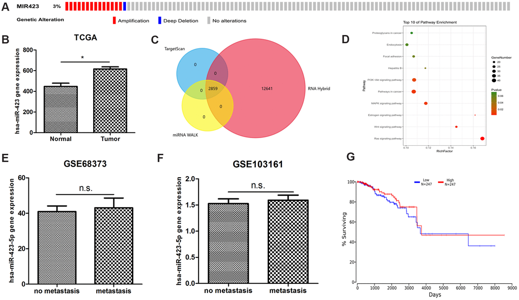 We postulated that as an ideal marker, for easy detection, should be highly expressed in tumor tissues compared to adjacent cancer or breast tissue. We noticed that the expression of hsa-miR-423-5p in serum of breast cancer patients is at moderate or high levels, which is not detectable or detectable at low-levels in healthy human serum. By interrogating copy number alteration data of tumor samples recorded in cBioportal [9, 10], we found that 2.9% (14 of 482) of patients showed gene amplification [11] (Figure 1A). We next analyzed RNA sequencing data in TCGA breast cancer datasets, which showed that breast cancer patients are of increased hsa-miR-423 expression (Figure 1B). These results suggested that hsa-miR-423 had potential biological significance in breast cancer. We further explored the potential biological role of hsa-miR-423-5p by investigating its high confidential target genes. According to the Mendel score, 1404 highly confident miRNA target genes were selected out of a total of 60996 predicted genes (Supplementary Table 1). Similarly, the prediction results of high confidential miRNA target lncRNA (Mendel score ≥ 3, Figure 1C) are presented in Supplementary Table 2. Subsequently, pathway enrichment analysis of highly confidential miRNA target genes was performed. The data indicated that hsa-miR-423-5p targeting mRNAs were enriched in cancer-relevant pathways, including pathways in cancer, MAPK signaling pathway, Wnt signaling pathway, and the Ras signaling pathway (Figure 1D). However, hsa-miR-423-5p was not differentially expressed between breast cancer metastasis and non-metastasis samples (Figure 1E, 1F) and did not affect prognosis (Figure 1G) in clinical samples, which indicated that hsa-miR-423-5p mainly functions in cancer initiation and development rather than playing pivotal roles in advanced breast cancer.