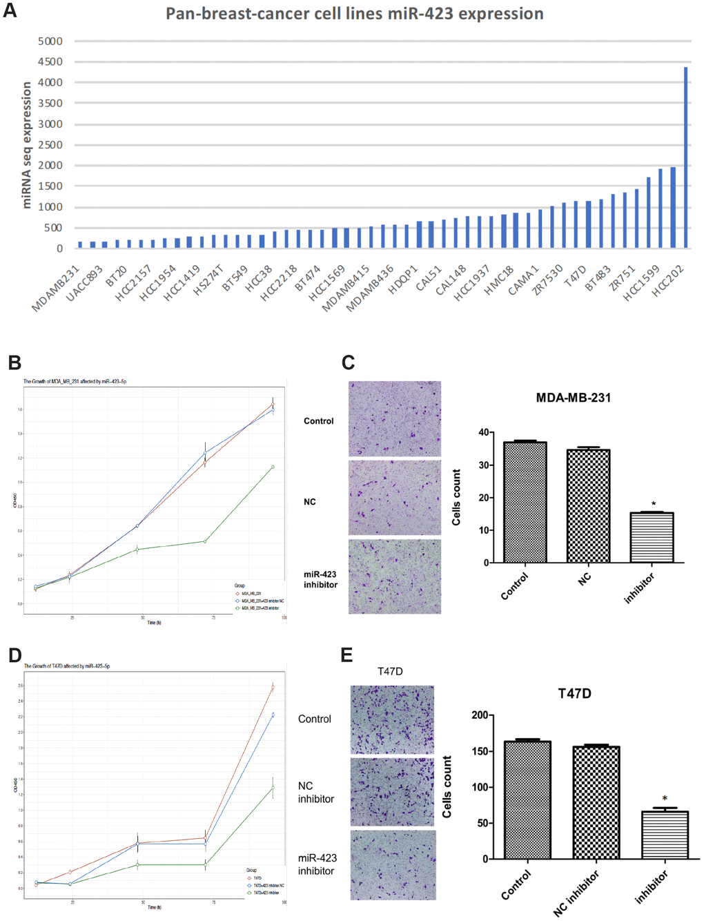 Based on the abnormal expression of hsa-miR-423-5p, we next explored its roles in breast cancer development. First, hsa-miR-423-5p expression in breast cancer cell lines (MDA-MB-231, UACC-893, BT-20, HCC2157, HCC1954, HCC1419, HS274T, BT-549, HCC38, HCC2218, BT-474, HCC1569, MDA-MB-415, MDA-MB-436, HDQP1, CAL51, CAL-148, HCC1937, HMC18, CAMA-1, ZR7530, T47D, BT-483, ZR751, HCC1599, and HCC202) were investigated by using Cancer Cell Line Encyclopedia (CCLE) data (Figure 2A) [12]. MDA-MB-231 cell and T47D cell representing lower and upper top 20% expression were selected out as the appropriate cell lines for in vitro studies. With hsa-miR-423-5p knockdown in transfected cell lines (Supplementary Figure 1), the cell viability assay showed that hsa-miR-423-5p inhibitors reduced the cell viability of both MDA-MB-231 and T47D cells when compared with the negative control (NC) group (P<0.05) (Figure 2B, 2D). This is further supported by the observation that the knockdown of hsa-miR-423-5p significantly inhibit breast cancer cell line in vivo (P<0.05, Supplementary Figure 2A, 2B). Real-time fluorescent quantitative PCR was used to detect the expression of stem cell-associated genes c-Myc, KLF4, and SOX2, resulting that the mRNA levels of stem cell-related genes were significantly reduced after miR-423-5p knockdown (Supplementary Figure 3A, 3C). Transwell assays indicated that knockdown of the hsa-miR-423-5p inhibitor significantly inhibited MDA-MB-231 and T47D invasion (P<0.05) (Figure 2C, 2E), potentiating cancer cell migration to normal cells. The above results suggest that miR-423-5p has a potential function for maintaining the stemness of breast cancer stem cells, cell growth, and initialization of cell migration.