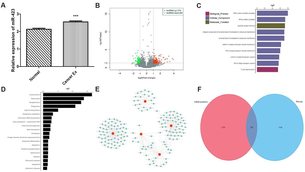 Given that in vitro and in vivo studies demonstrating a role of hsa-miR-423-5p in breast cancer growth, we proposed that breast cancer cells could release hsa-miR-423-5p to the blood via exosomes, facilitating proliferation process. After successful exosome extraction (Supplementary Figure 4), the hsa-miR-423-5p expression level in breast cancer serum exosomes was significantly higher compared to that of those in serum of healthy female volunteers (Figure 3A). Next, we hypothesized that the transcriptome status in exosomes could also be different between healthy women and breast cancer patients. Therefore, the expression landscape of mRNA and lncRNA were observed by exosomal RNA sequencing. In brief, in the breast cancer group, 260 lncRNA transcripts (170 upregulation and 90 downregulation) and 110 mRNA transcripts (79 upregulation and 31 downregulation) were differently expressed when compared to the control group (Figure 3B, Supplementary Table 3). To illustrate the potential biological impact of hsa-miR-423-5p alterations on breast cancer development, we conducted Gene ontology (GO) and Kyoto Encyclopedia of Genes and Genomes (KEGG) analysis. GO analysis showed that the top ten enriched biological process included the major histocompatibility complex (MHC) class II protein complex, MHC protein complex, peptide antigen binding, integral component of the luminal side of the endoplasmic reticulum, luminal side of the endoplasmic reticulum membrane, clathrin-coated endocytic vesicle membrane, endoplasmic reticulum (ER) to the Golgi transport vesicle, clathrin-coated endocytic vesicle, ER to Golgi transport vesicles, and T-cell co-stimulation (Figure 3C). Genes in these pathways were selected for QPCR analysis. Consistent with bioinformatic prediction of the trend of gene expression, the expression level of selected immune genes in in vivo tissues varied, suggesting that hsa-miR-423-5p affects immune regulation at multiple levels (Supplementary Figure 2C–2E). The KEGG pathway analysis maps the dysregulated protein-coding genes to enriched signal pathways, which include leishmaniasis, Tuberculosis, Toxoplasmosis, phagocytosis, and arginine biosynthesis (Figure 3D). Our data showed that a co-expression network between 1319 lncRNA and 143 mRNAs consisted of 1462 network nodes and 15255 connections (Supplementary Table 4). The co-expression network revealed that one mRNA may be associated with 1 to 56 lncRNAs, and that one lncRNA may be associated with 28 to 189 mRNAs, suggesting that for peptide binding, 162 lncRNAs interacted with 5 mRNAs (Figure 3E). The Venn diagram showed intersected genes of predicted hsa-miR-423-5p mRNA targets and differential expressed mRNAs in exosomes (Figure 3F), indicating that hsa-miR-423-5p preserved several pivotal microRNA signals during exosomal secretion.
