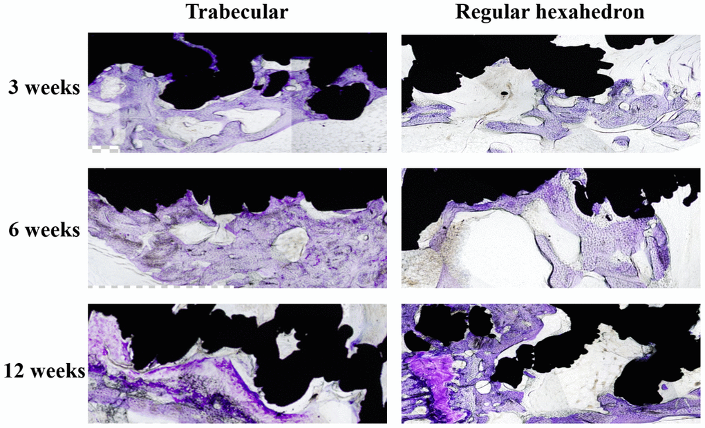 The histological measurement results are shown in Table 1 and Table 2. These results show that the bone in-growth percentage area in the trabecular structure implant group was significantly larger than the classic structure control group at 3 and 6 weeks (P < 0.05), but no significant differences were found at 12 weeks (P > 0.05). Furthermore, there were significant differences within both of the two groups when intergroup pairwise comparisons were performed in both groups (P < 0.05) (Table 3).