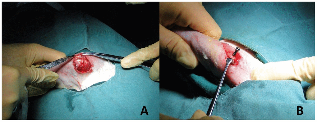 From August 2018 to May 2019, thirty skeletally-matured (four months old) male, New Zealand, big-ear white rabbits were randomly divided equally into two groups, a study group and control group, weighing between 2.53 kg and 2.71 kg. Each of the rabbits were fed in a single cage with common rabbit food and observed for two weeks before the surgery. They were confirmed to be healthy and without other disease. The disposal of animals conformed to the standards of medical ethics.