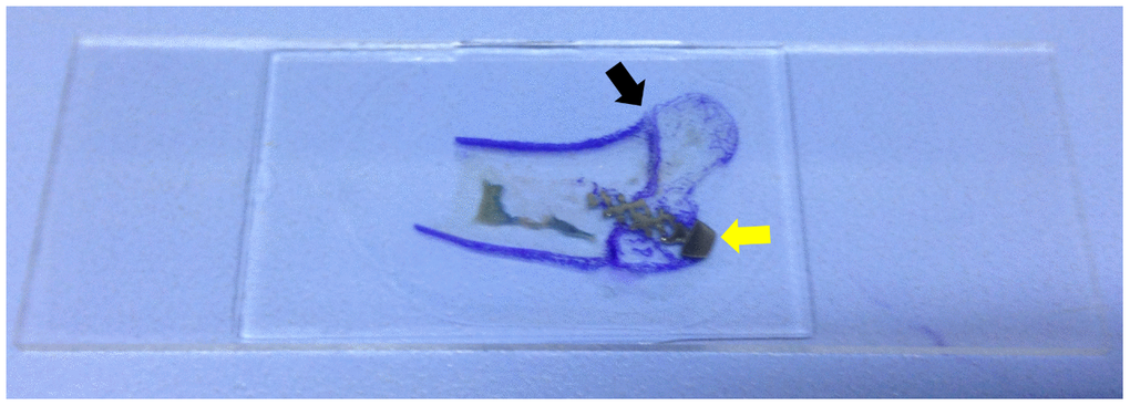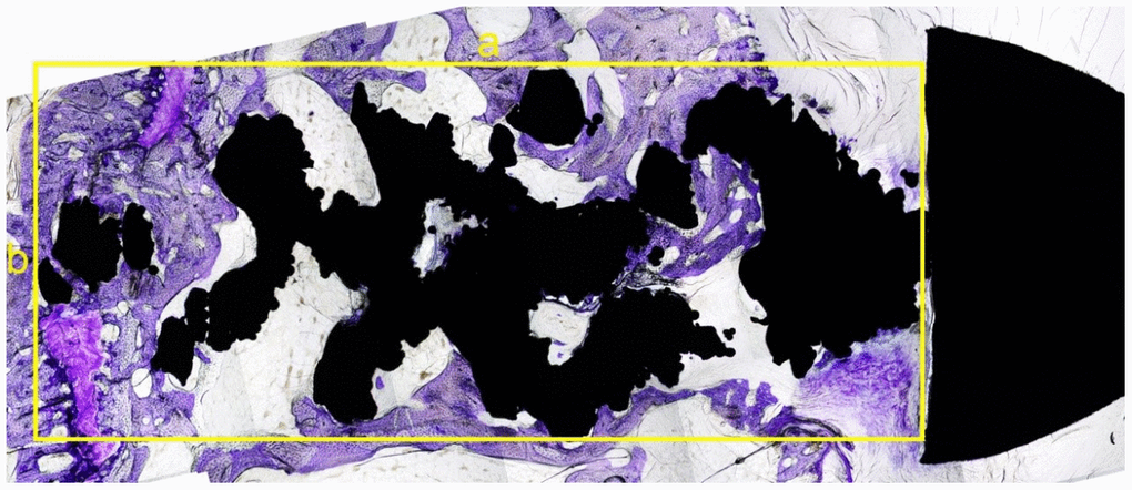 Rabbits woke up naturally after the surgery, were fed regularly, and raised in the cages (65 cm × 40 cm × 40 cm) to restrict their movement; however, the affected limb was not immobilized. Intramuscular injection of penicillin (4 × 105 U) was performed during the first three days after modeling to prevent infection. Specimens were collected from the two groups of rabbits 3, 6, and 12 weeks after surgery; five rabbits were collected from both groups each time. The bone specimens from the humerus head to the distal end (at least 3 cm) were preserved, and all muscles and soft tissues were removed. Neutral formalin was used for specimen fixation for 48h, followed by dehydration through an alcohol gradient (concentrations: 70%, 80%, 90%) for 7 days, and 100% dehydration twice for 2 days each time. After soaking the specimens in photocurable resin (Technovit7200VLC) for one month, the specimens were performed with a Photocure embedding technique. Then, an EXAKT Hard Tissue Cutting System (EXAKT 400CS/Aw Micro Grinding System) was used to slice the specimen parallel to the shaft of the humerus through the anatomical axis. About 1 mm of bone tissue was reserved on the inside and outside of the axis, respectively. Toluidine blue staining was performed on all of the specimen slices (Figure 4). The image was then reviewed under an optical microscope at 4× magnification. The bone in-growth area was measured and analyzed using Image-Pro Plus software. A rectangle was made on the sagittal section that contained both the long diameter a (mm) and wide diameter b (mm) of the screw (nut removed). The total area was defined as S0 (S0 = a × b, mm2). Thereafter, the bone in-growth tissue area that could be stained with toluidine blue within the rectangle above was calculated using Image-Pro Plus software (S1, mm2). The percentage of bone in-growth tissue area was defined as S% (S%=S1/S0×100%) (Figure 5). All histological measurements were performed by the same operator. Figure 4 is a schematic diagram of implant slices with classical regular hexahedron structure.