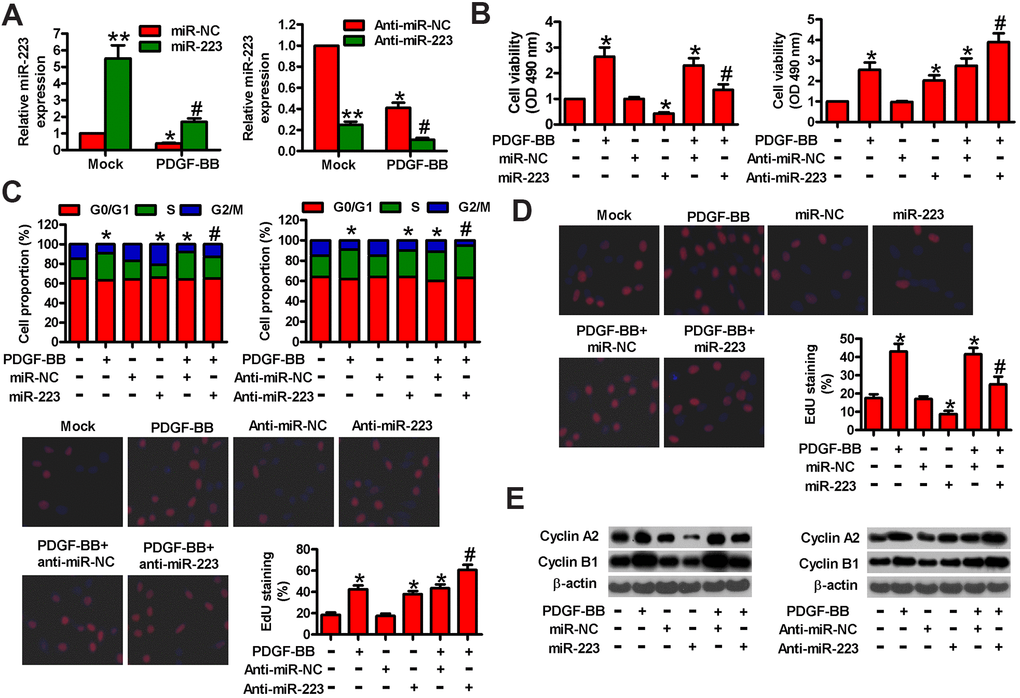 To investigate the role of miR-223 in PDGF-BB-induced HASMC proliferation, miR-223, miR-NC, anti-miR-223, or anti-miR-NC was transfected into HASMCs. As expected, miR-223 was upregulated in miR-223-transfected HASMCs or downregulated in anti-miR-223-treated HASMCs in the presence or absence of PDGF-BB (Figure 2A). We then performed MTT, EdU incorporation, and flow cytometry assays to determine the effects of miR-223 on cell viability, proliferation, and cell cycle progression. As shown in Figure 2B, miR-223 inhibited the viability of PDGF-BB-treated HASMCs compared with miR-NC-transfected groups. MiR-223 induced G2/M phase arrest in PDGF-BB-exposed HASMCs (Figure 2C). Consistently, miR-223 repressed the PDGF-BB-stimulated proliferation of HASMCs (Figure 2D). However, miR-223 depletion markedly enhanced the viability (Figure 2B) and the S phase proportion (Figure 2C) of PDGF-BB-stimulated HASMCs while increasing their proliferation (Figure 2D). Next, we measured the expressions of two proliferative regulators (cyclin A2 and cyclin B1) that promote S phase and G2/M progression. As shown in Figure 2E, the levels of cyclin A2 and cyclin B1 were increased in PDGF-BB-treated cells and substantially decreased in miR-223-transfected cells. MiR-223 inhibitor caused a further increase of cyclin A2 and cyclin B1 in PDGF-BB-treated cells (Figure 2E). These data indicate that PDGF-BB-induced proliferation of HASMCs is partly suppressed by miR-223.