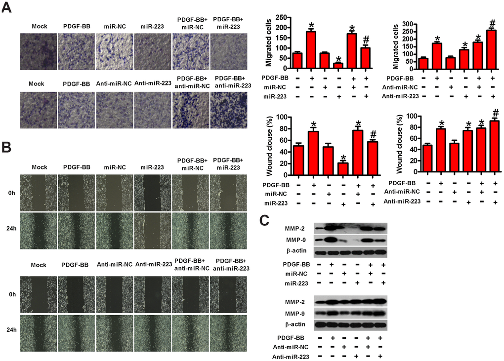 To explore whether miR-223 affects the migration of HASMCs, we performed transwell and wound healing assays. Figure 3A shows that miR-223 transfection reduced the PDGF-induced migration of HASMCs compared with controls. Conversely, the downregulation of miR-223 promoted PDGF-induced HASMC migration. Similarly, wound healing assay revealed a decrease in the PDGF-induced migration of HASMCs with miR-223 transfection but the increased migration in anti-miR-223-transfected cells (Figure 3B). At the molecular level, the expressions of MMP-2 and MMP-9, two metastasis-promoting markers, were downregulated after transfection with miR-223, whereas anti-miR-223 treatment elevated MMP-2 and MMP-9 levels in PDGF-stimulated HASMCs (Figure 3C). These results confirm the inhibitory effects of miR-223 on PDGF-induced HASMC migration.