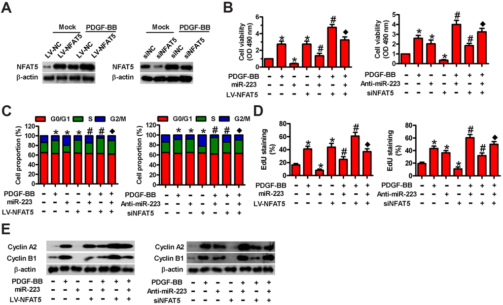 To probe whether NFAT5 plays a functional role in miR-223-elicited repression of PDGF-BB-induced HASMC proliferation, we carried out MTT, EdU, and flow cytometry assays. We found that LV-NFAT5 infection increased NFAT5 levels in HASMCs with or without PDGF stimulation (Figure 5A), while siNFAT5 transfection reduced them. As depicted in Figure 5B, NFAT5 overexpression counteracted the suppression of cell viability by miR-223 in PDGF-treated HASMCs. Conversely, the increased cell viability by miR-223 inhibitor was reduced by siNFAT5 transfection (Figure 5B). Flow cytometry results showed that miR-223 transfection increased HASMCs at the G2/M phase arrest, whereas anti-miR-223 treatment promoted cell cycle progression of PDGF-stimulated HASMCs (Figure 5C). However, overexpression or knockdown of NFAT5 reversed these alterations (Figure 5C). The reduction or augmentation of proliferation induced by miR-223 introduction or depletion in HASMCs with PDGF stimulation was reversed by NFAT5 overexpression or silencing, respectively (Figure 5D). Molecularly, the miR-223- induced downregulation or anti-miR-223-induced upregulation of cyclin A2 and cyclin B1 in PDGF-stimulated HASMCs was counteracted by NFAT5 overexpression or knockdown, respectively (Figure 5E). These evidences show that NFAT5 is implicated in the miR-223-caused proliferative inhibition of PDGF-BB-treated HASMCs.