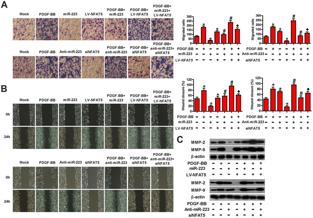 To investigate whether NFAT5 contributed to miR-223-led migration inhibition of PDGF-BB-treated HASMCs, we conducted transwell and wound healing assays. As shown in Figure 6A, LV-NFAT5 infection abated the miR-223-induced repression in the migration of PDGF-BB-exposed HASMCs. However, the miR-223 knockdown- induced increase in the migration of PDGF-BB-stimulated HASMCs was reduced by siNFAT5 transfection. Wound healing assay also demonstrated that NFAT5 overexpression rescued the inhibitory effect of miR-223 on PDGF-BB-induced migration of HASMCs. By contrast, NFAT5 knockdown counteracted the enhanced migratory ability of PDGF-BB-stimulated HASMCs by miR-223 depletion (Figure 6B). The expressions of MMP-2 and MMP-9 were downregulated by miR-223 introduction and were upregulated by miR-223 knockdown in PDGF-BB-stimulated HASMCs, which were reversed by NFAT5 overexpression and silencing, respectively (Figure 6C). These results suggest that NFAT5 conduces to the miR-223-decreased migration of PDGF-BB-treated HASMCs.