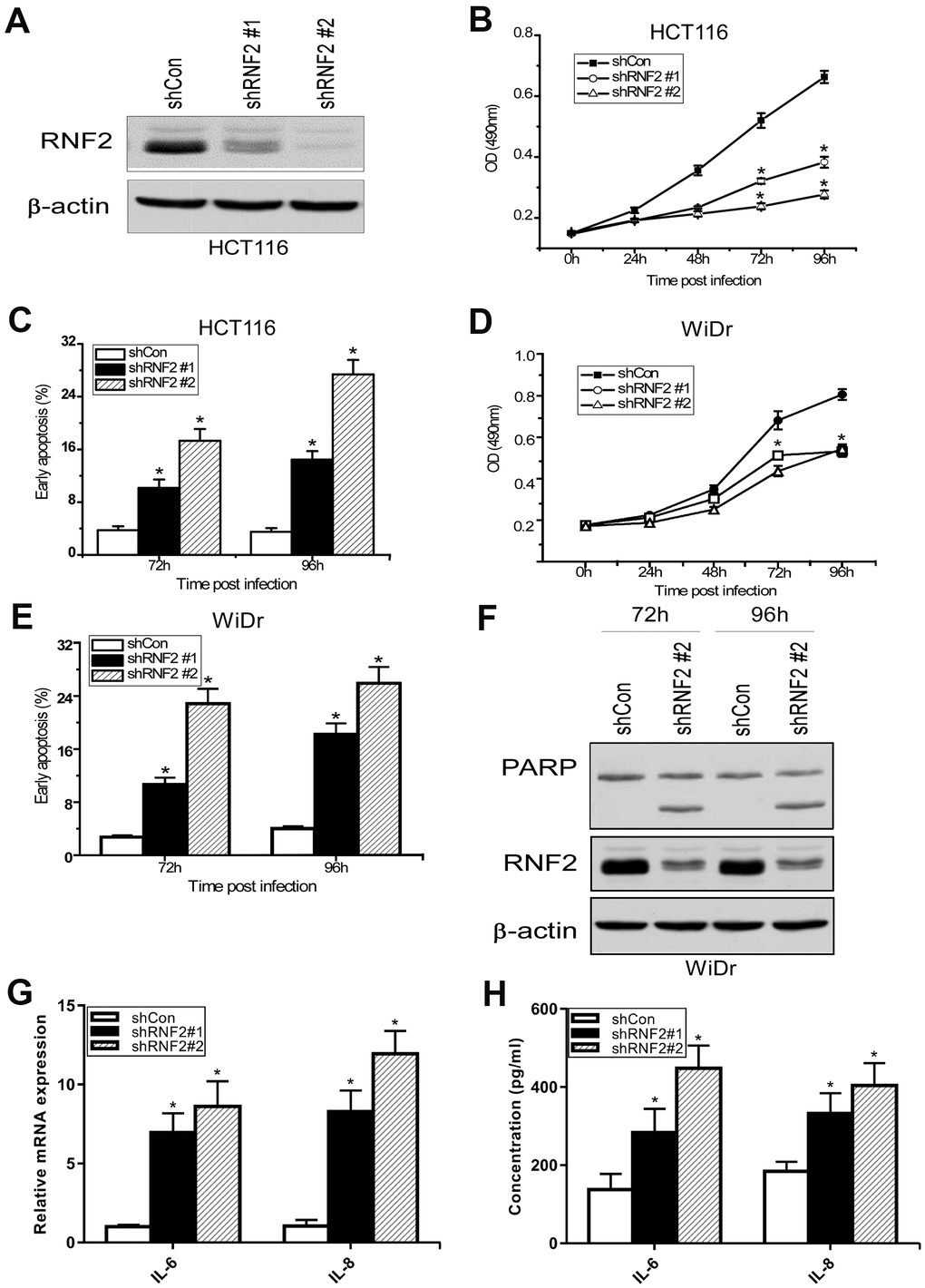 To study the function of RNF2 in CRC cells, we first assessed RNF2 levels in several CRC cell lines and a normal colon cell line (CRL-1459). RNF2 levels were obviously higher in all the CRC cells we examined than in normal colon cells (Supplementary Figure 2A). Then, we used short hairpin RNA (shRNA)-expressing lentiviruses to knock down RNF2 in HCT116 and WiDr cells, and confirmed the knockdown efficiency using Western blotting (Figure 2A, 2F). A 3-(4,5-dimethylthiazol-2-yl)-2,5-diphenyltetrazolium bromide (MTT) assay demonstrated that cell proliferation was dramatically inhibited in RNF2-knockdown HCT116 and WiDr cells (Figure 2B, 2D). To evaluate the effects of RNF2 downregulation on the survival of cells, we used flow cytometry to analyze apoptosis. The results indicated that knocking down RNF2 increased apoptosis in both HCT116 and WiDr cells, based on the increased Annexin V+/propidium iodide- cell percentages (Figure 2C, 2E). We also examined the cell cycle, and found that the proportion of cells in sub-G1 phase was greater in RNF2-knockdown cells than in control cells, further confirming that apoptosis was induced in RNF2-knockdown cells (Supplementary Figure 2B).