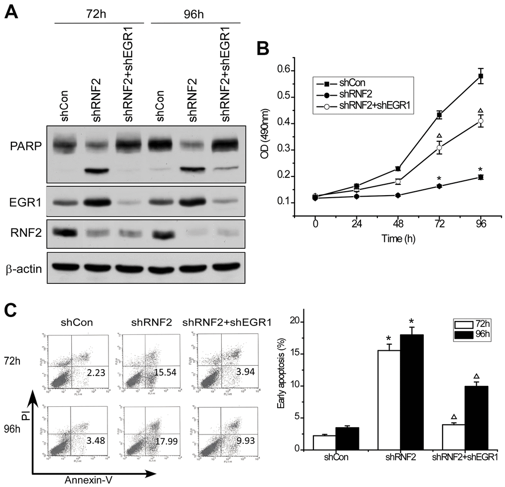 Knocking down EGR1 partially reversed the inhibition of cell proliferation and the increase in apoptosis in RNF2-knockdown cells