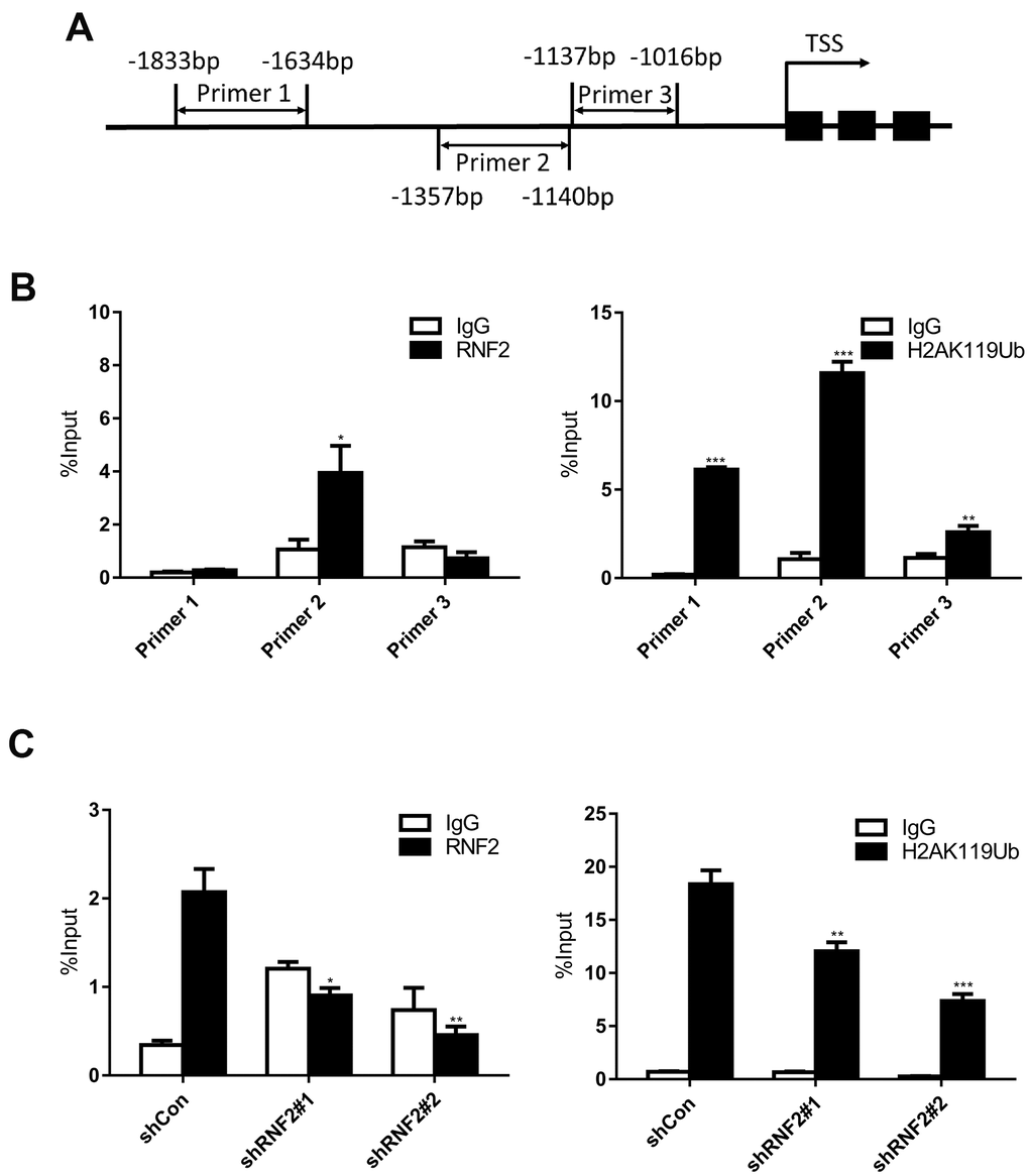 The downregulation of RNF2 reduced both RNF2 enrichment and H2A mono-ubiquitination at the EGR1 promoter