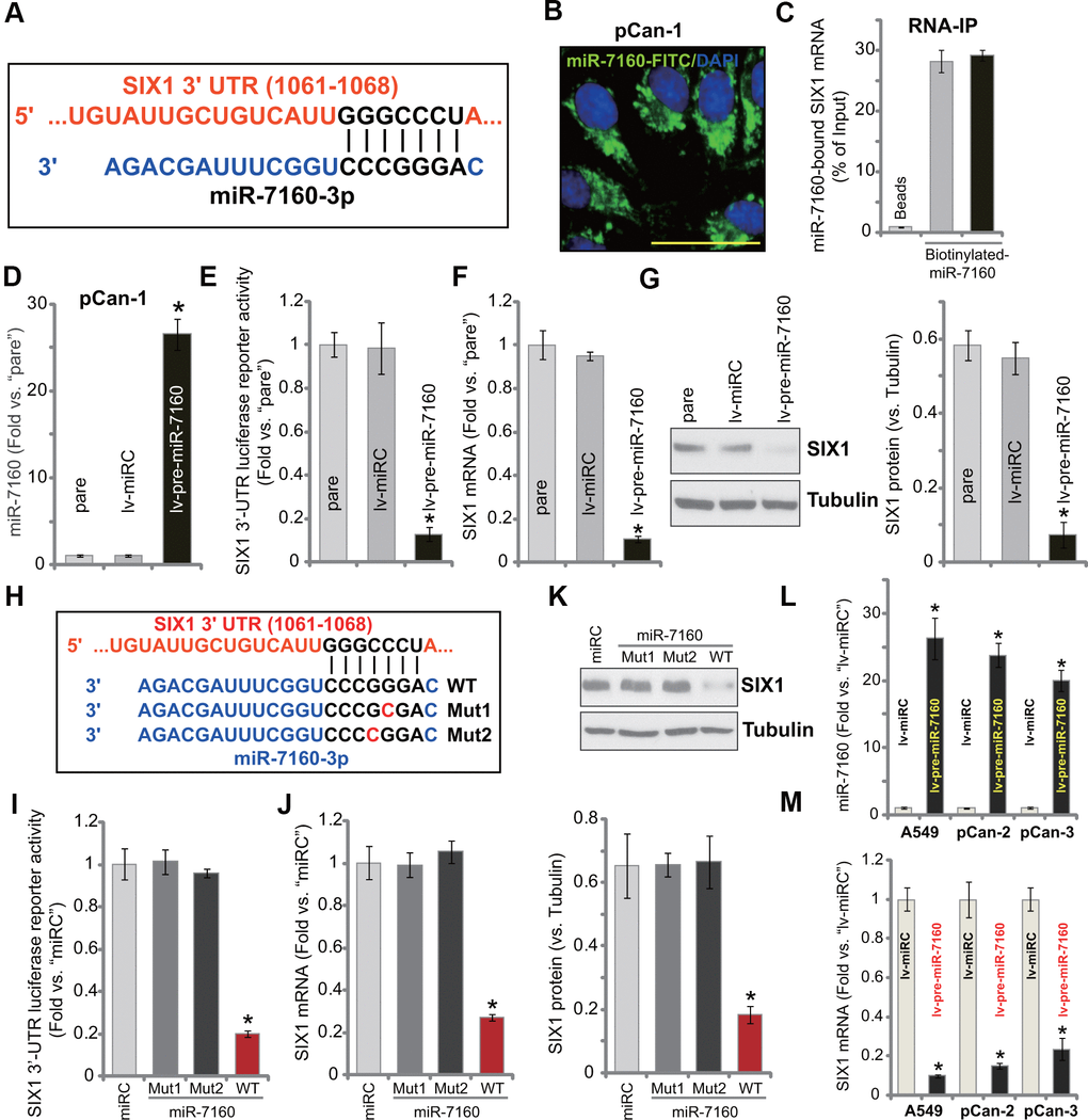 A lentiviral construct expressing pre-miR-7160 (lv-pre-miR-7160) was established. It was transduced to pCan-1 cells. With puromycin selection stable cells were established. The mature miR-7160 (-3p) expression increased over 25 folds in stable pCan-1 cells with lv-pre-miR-7160 (Figure 1D). Forced miR-7160 overexpression led to dramatic reduction of SIX1 3’-UTR luciferase reporter activity in pCan-1 cells (Figure 1E). SIX1 mRNA (Figure 1F) and protein (Figure 1G) expression was significantly downregulated.