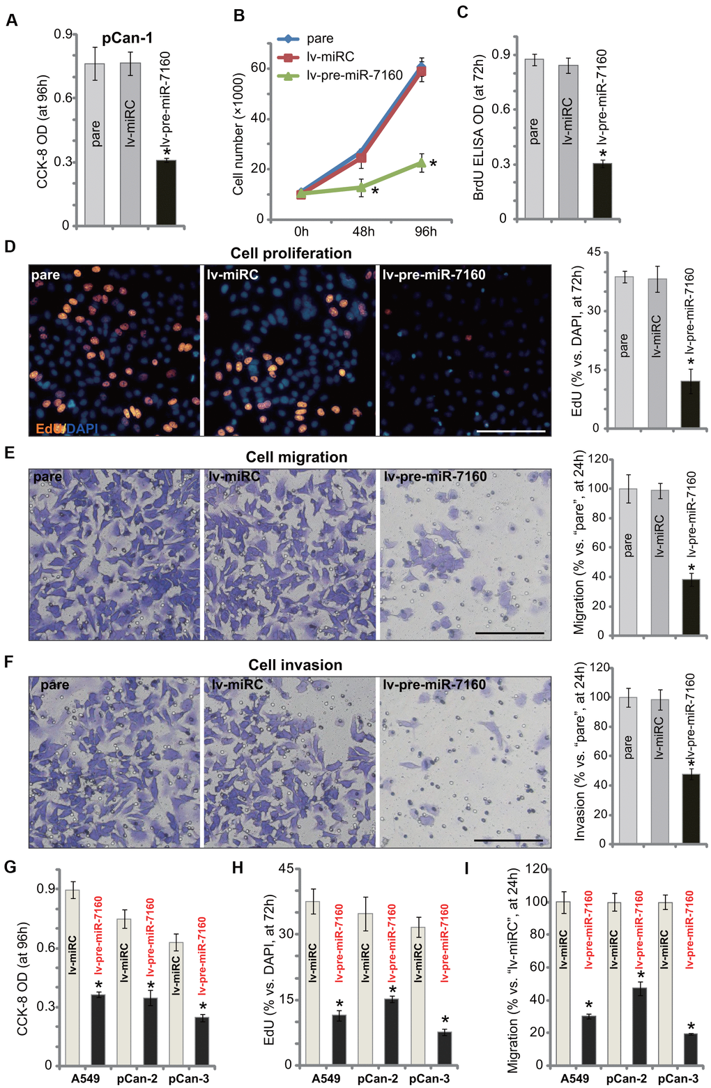 SIX1 overexpression is important for proliferation, migration and invasion as well as EMT and chemo-resistance of NSCLC [25–28]. In Figure 1 we show that miR-7160 silenced SIX1, we tested its effect on functions of NSCLC cells. CCK-8 assay results demonstrated that forced overexpression of miR-7160, by lv-pre-miR-7160 (see Figure 1), largely inhibited viability of pCan-1 cells (Figure 2A). Figure 2B showed that lv-pre-miR-7160-expressing pCan-1 cells grew significantly slower than control cells with lv-miRC. In pCan-1 cells, miR-7160 overexpression inhibited BrdU incorporation (Figure 2C) and EdU-positive nuclei ratio (Figure 2D), indicating proliferation inhibition. In pCan-1 cells with lv-pre-miR-7160, migration and invasion were significantly inhibited (Figure 2E, 2F). The lv-miRC had no significant effect on the cellular functions of pCan-1 cells (Figure 2A–2F). In A549 cells and other primary NSCLC cells (pCan-2/pCan-3), lv-pre-miR-7160 similarly inhibited cell viability (CCK-8 OD, Figure 2G) and proliferation (EdU-positive nuclei ratio, Figure 2H). In vitro cell migration was inhibited as well (Figure 2I). Therefore, ectopic overexpression of miR-7160 inhibited NSCLC cell growth, proliferation, migration and invasion.