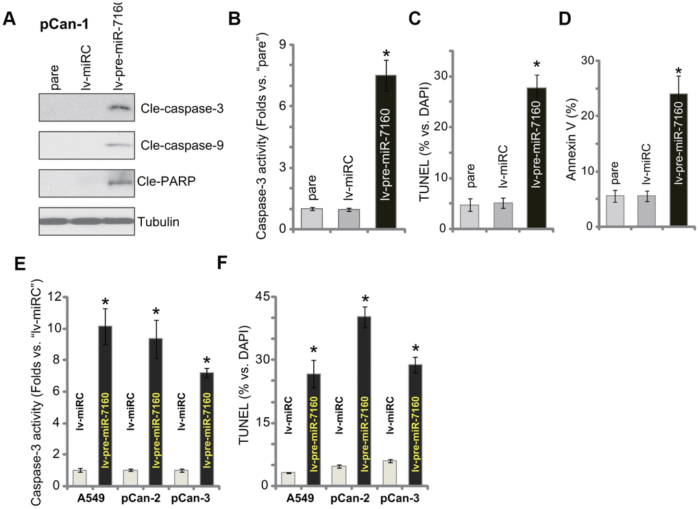 We tested potential activity of miR-7160 on cell apoptosis. As demonstrated, in pCan-1 NSCLC cells-expressing lv-pre-miR-7160, we detected cleavages of caspase-3, caspase-9 and poly (ADP-ribose) polymerase (PARP) (Figure 3A). The caspase-3 activity increased over seven folds in miR-7160-overexpressed cells (Figure 3B). The TUNEL-positive cell nuclei percentage was significantly increased in lv-pre-miR-7160-expressing pCan-1 cells (Figure 3C), indicating apoptosis activation. It was further supported by the increased ratio of Annexin V-positive staining (Figure 3D). The control lv-miRC failed to induce apoptosis activation in pCan-1 cells (Figure 3A–3D). In established A549 cells and other primary NSCLC cells (pCan-2/pCan-3), the caspase-3 activity (Figure 3E) and TUNEL-positive nuclei ratio (Figure 3F) were significantly increased by lv-pre-miR-7160. Collectively, miR-7160 overexpression provoked apoptosis in NSCLC cells.