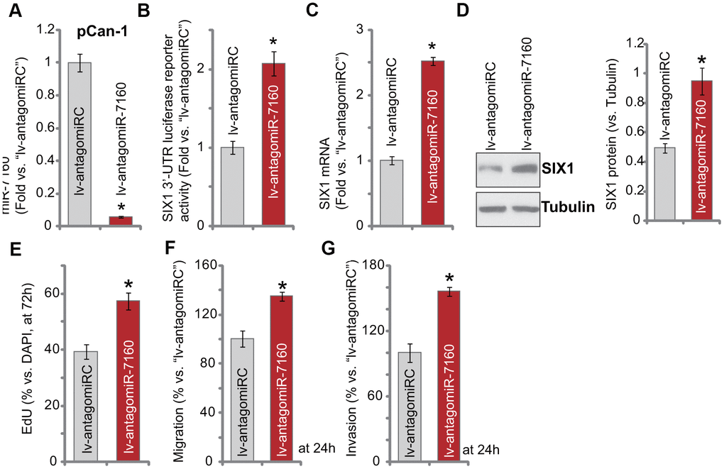 We further hypothesized that miR-7160 inhibition should increase SIX1 expression. A lentiviral construct containing pre-miR-7160 anti-sense sequence, lv-antagomiR-7160, was transduced to pCan-1 cells. Through puromycin selection stable cells were established. As compared to the control pCan-1 cells with non-sense construct (“lv-antagomiRC”), miR-7160 expression in lv-antagomiR-7160 cells decreased over 90% (Figure 4A). Conversely, lv-antagomiR-7160 resulted in over two-fold increase of SIX1 3’-UTR luciferase reporter activity (Figure 4B). Expression of SIX1 mRNA (Figure 4C) and protein (Figure 4D) was subsequently elevated. Functional studies demonstrated lv-antagomiR-7160 augmented pCan-1 cell proliferation (nuclear EdU ratio increase, Figure 4E), migration and invasion (“Transwell” assays, results quantified in Figure 4F, 4G). These results show that miR-7160 inhibition augmented SIX1 expression and NSCLC cell progression in vitro.
