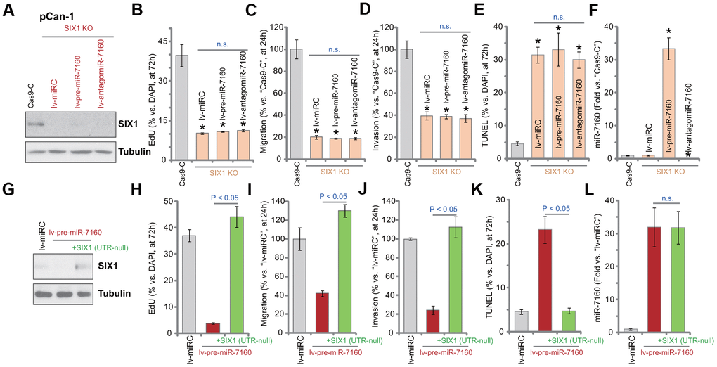 A CRISPR/Cas9-SIX1-KO-GFP construct was transduced to pCan-1 cells. FACS-mediated GFP sorting and puromycin selection were then carried out to select stable cells: SIX1 KO cells. Western blotting assay results, Figure 5A, confirmed that SIX1 protein was depleted in the SIX1 KO cells. SIX1 KO largely inhibited pCan-1 cell proliferation (nuclear BrdU incorporation, Figure 5B), migration and invasion (“Transwell” assays, Figure 5C, 5D), while inducing cell apoptosis (TUNEL-positive nuclei ratio increase, Figure 5E). Thus, mimicking lv-pre-miR-7160, SIX1 KO produced significant anti-NSCLC cell activity. Importantly, in SIX1 KO cells, exogenously altering miR-7160 expression by lv-pre-miR-7160 or lv-antagomiR-7160 (Figure 5F) failed to change cellular functions (Figure 5B–5E). Therefore, in SIX1 KO cells miR-7160-induced anti-cancer activity was compromised.
