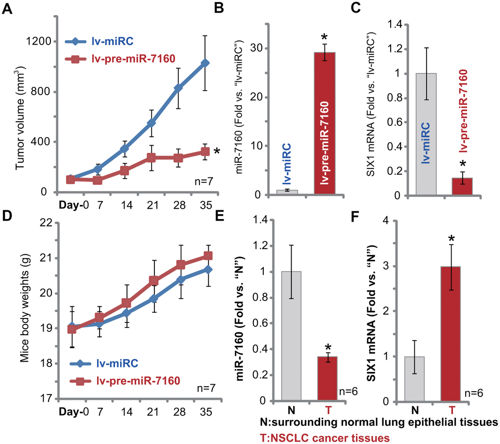 In order to study the potential effect of miR-7160 on NSCLC cell growth in vivo, we injected pCan-1 cells to the flanks of SCID mice. NSCLC xenografts were established within three weeks, when tumor volumes reached approximately 100 mm3 (“Day-0”). NSCLC xenografts were than subjected to intratumoral administration of either lv-pre-miR-7160 or lv-miRC. Tumor growth curve results, Figure 6A, demonstrated that NSCLC xenografts with lv-pre-miR-7160 injection grew significantly slower than control NSCLC xenografts with lv-miRC. Tumor volumes in lv-pre-miR-7160 group were significantly lower than lv-miRC tumors (Figure 6A). On Day-7, one tumor from each group was individually isolated. The qPCR assay results showed that mature miR-7160 levels increased over 25-30 folds in lv-pre-miR-7160-injected NSCLC xenografts (Figure 6B), with SIX1 mRNA significantly downregulated (Figure 6C). The animal body weights were not significantly different between the two groups (Figure 6D). Neither did we notice apparent signs of toxicity. Therefore, forced miR-7160 overexpression silenced SIX1 and inhibited NSCLC xenograft growth in SCID mice.