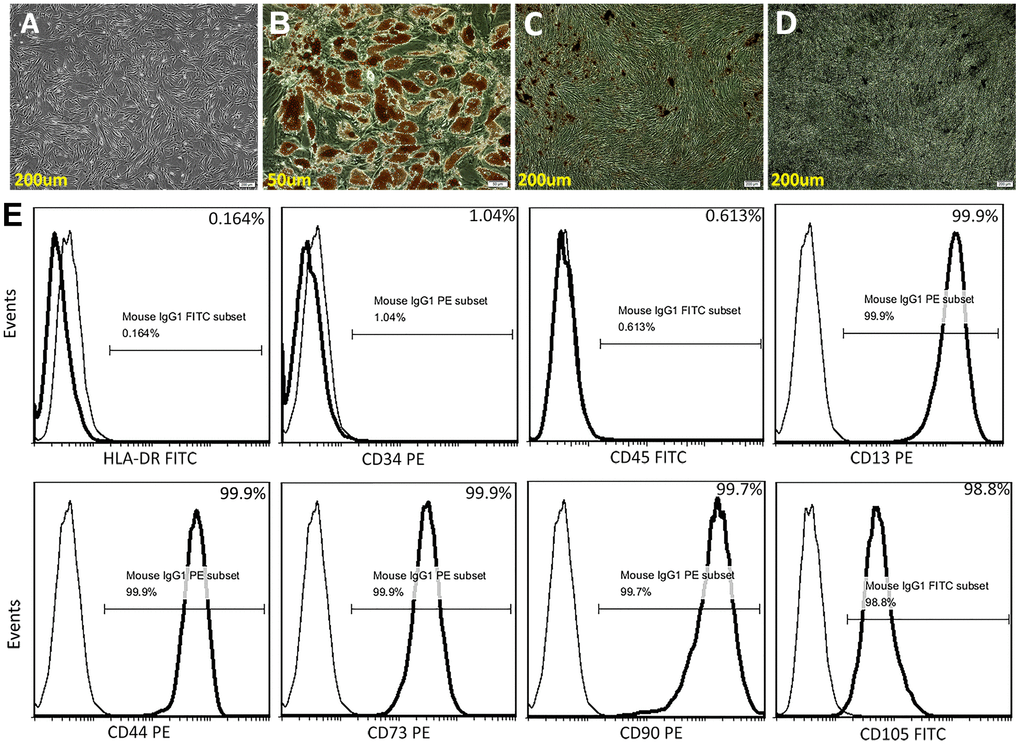 ADSCs in vitro exhibited a fibroblast-like morphology (Figure 1A), and differentiated into adipocytes and osteocytes, respectively, after 3 weeks of adipogenic and osteogenic induction (Figure 1B–1D). Flow cytometry showed that undifferentiated ADSCs expressed high levels of CD13, CD44, CD73, CD90 and CD105, and were negative for the hematopoietic stem cell markers HLA-DR, CD34, and CD45 (Figure 1E).