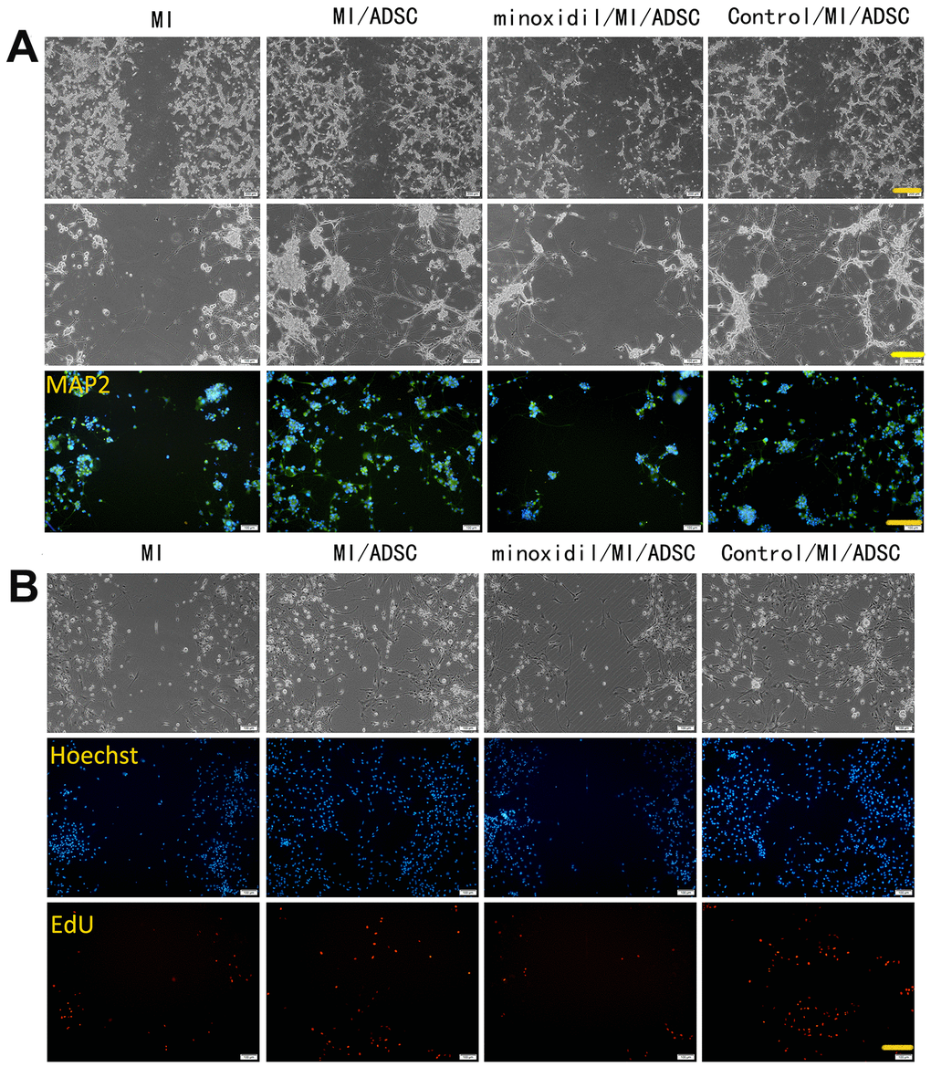 To investigate the influence of ADSCs on neuronal recovery from injury, a neuron- ADSC co-culture system was first established in vitro. A wound-healing assay involving mechanical injury (MI) was then performed on both differentiated PC12 cells and rat cortical neurons. Results showed that wound closure rates were significantly higher in cells co-cultured with ADSCs (plated on Transwell inserts) for 72 h (Supplementary Figure 1A). Moreover, EdU assays showed that co-cultured ADSCs enhanced the proliferation of rat cortical neurons (Supplementary Figure 1B). Accordingly, lactate dehydrogenase (LDH) release assay results indicated that neuronal damage induced by MI was reversed by ADSC co-culturing (Figure 2A).