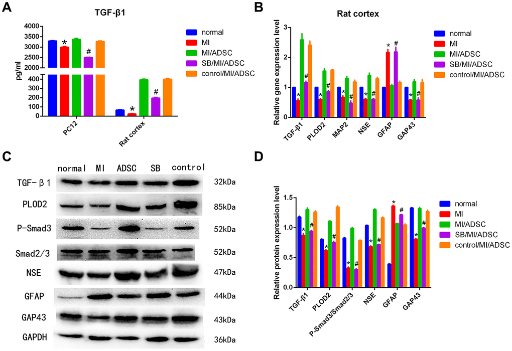 Then, we assessed whether ADSC-mediated PLOD2 upregulation in neurons subjected to MI is affected by TGF-β1 inhibition with SB431542 (SB). As expected, ELISA results showed that the expression of TGF-β1 was significantly decreased in the SB/MI/ADSC group, compared with the MI/ADSC and the dimethyl sulfoxide (DMSO) control groups (Figure 5A). In turn, both qRT-PCR and western blot analyses showed that the expression of TGF-β1, P-Smad3, and PLOD2 was significantly decreased in the SB/MI/ADSC group, compared to the MI/ADSC and the DMSO control groups (Figure 5B–5D). These analyses also showed that the expression of MAP2, NSE, and GAP43 was significantly decreased, while GFAP levels were significantly increased, upon SB/MI/ADSC treatment (Figure 5B–5D). We thus concluded that the neurorestorative effect of ADSCs is due to an increase in PLOD2 expression induced by TGF-(1 stimulation and Smad3 activation.