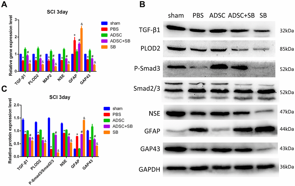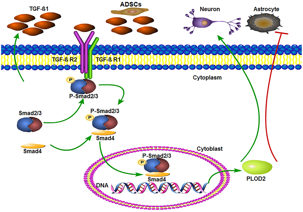 Meanwhile, ELISA results showed increased serum levels of TGF-β1 in ADSC-implanted rats, an effect that was significantly reversed by co-administration of SB431542 (Figure 7D). In turn, qRT-PCR and western blot assays showed upregulation of TGF-β1, P-Smad3, PLOD2, MAP2, NSE, and GAP43, and downregulation of GFAP expression in SCI samples 3 days after ADSC transplantation. These changes were reversed, however, following SB431542 treatment (Figure 8A–8C). Consistent with our in vitro results, these data demonstrate that ADSCs promote functional recovery in SCI rats through the release of TGF-β1 and stimulation of PLOD2 expression by spinal cord cells. This creates a favorable environment for the regeneration of neurons and axons, while reducing glial scar development (Figure 9).