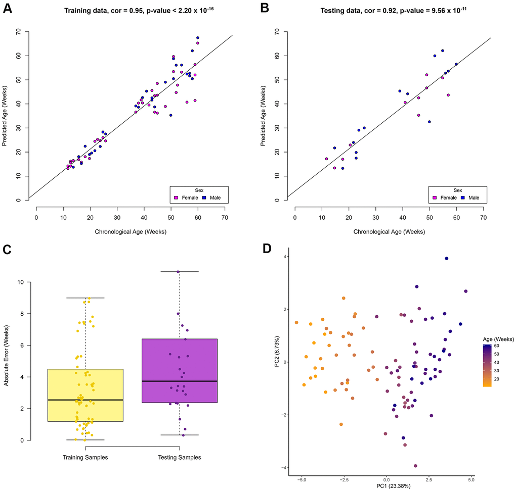 An elastic net regression model was used to regress age over the 70% of the RRBS samples (67 samples). The regression model returns the minimum number of sites required to estimate age (see Methods). Our model to estimate age in zebrafish using RRBS data was based on a total of 29 CpG sites (Supplementary Table 2). In the training data set a high correlation (Pearson correlation = 0.95, p-value < 2.20 x 10-16) between the chronological and predicted age was observed (Figure 1A). In addition, a high correlation (Pearson correlation = 0.92, p-value = 9.56 x 10-11) between these variables in the testing data set was also observed (Figure 1B). A median absolute error (MAE) rate of 3.7 weeks was found in the testing data set (Figure 1C) and no statistical difference was observed between the absolute error rate between the training and testing data sets (p-value = 0.14, t-test, two-tailed). The similar performance between the training and testing data sets suggests a low possibility of overfitting. A PCA was used to visualise the separation of samples by age using the methylation levels of the 29 CpG sites (Figure 1D). The first principal component explains 23.4% of the variation by age. This unsupervised clustering shows separation of the samples solely on increasing age, suggesting the 29 CpG sites are ideal candidates to estimate age. Samples did not cluster by sex suggesting the age associated sites are not sex specific (Supplementary Figure 2). No significant gene ontology (GO) enrichment was observed for the 29 CpG sites using Enrichr. Using a zebrafish background set of genes, four genes (meis2a, gnptab, hoxb3a, mab21l2) relating to embryonic skeletal system morphogenesis were identified (adjusted p-value = 0.06). It should be noted that this is not a significant GO result. However, it is a similar pattern to what has been observed in age associated CpG sites in humans as many are related to embryonic development [14]. From here on the 29 CpG sites will be referred to as the zebrafish clock sites.