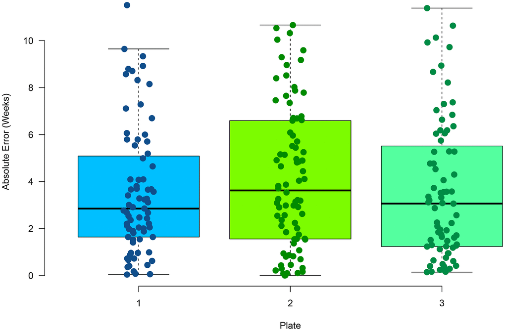 Multiplex PCR has been used previously to measure DNA methylation at select CpG sites [40]. In comparison to RRBS, it provides a 100-fold decrease in sequencing cost, making a more cost-effective approach for targeted sequencing. For each zebrafish clock CpG site, primers were designed to amplify an approximate 140bp amplicon inclusive of the CpG site (Supplementary Table 3). Three CpG sites were removed from the model due to lack of amplification by primers (see Methods). Caudal fin tissue from 96 zebrafish that were not part of the initial RRBS and aged between 10.9 - 78.1 weeks was used to test the multiplex PCR assay. Samples were assayed in triplicate to determine reproducibility of the method. On average, 459,000 reads were aligned to the reference genome, with 15,248 reads per amplicon, with an alignment rate of 98.5%. By having a saturation of high read coverage per amplicon reduces any potential of read variation on methylation levels. We found a high average correlation across the replicates (Supplementary Figure 3) between the chronological and predicted age (Pearson correlation = 0.97) and a low average (mean) MAE of 3.18 weeks (Figure 2). No statistically significant difference was found between the absolute error rates between replicates (p-value = 0.366, one-way ANOVA), suggesting the method is highly reproducible. In addition, no statistically significant difference was found between the absolute error rate in the RRBS testing data set and the multiplex PCR samples (p-value = 0.23, t-test, two-tailed). This suggests RRBS and multiplex PCR return similar sensitivities in methylation values. A median relative error of 8.2% was also observed in the multiplex PCR assay. No significant difference was found between the residuals and increasing age (Supplementary Figure 4) suggesting a consistent relative error rate with age.