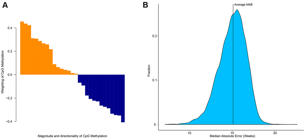 The elastic net regression model returns the minimum number of CpG sites required to estimate age. However, these sites differ in terms of importance for age prediction. Each CpG site has a different weight (Figure 3A), but collectively can be used to estimate age. This demonstrates that despite each CpG site having a different degree of age-association, collectively multiple CpG sites can be used to accurately estimate age [14]. To determine the level of age-association in other CpG sites we used a ridge model (α-parameter = 0 in glmnet) and randomly selected 29 CpG sites out of the possible 524,038 CpG sites. This was repeated 10,000 times and produced an average MAE of 15.1 weeks (Figure 3B). This analysis demonstrates that collectively CpG sites can be predictive of age, however certain CpG sites are better candidates as biomarkers of age.
